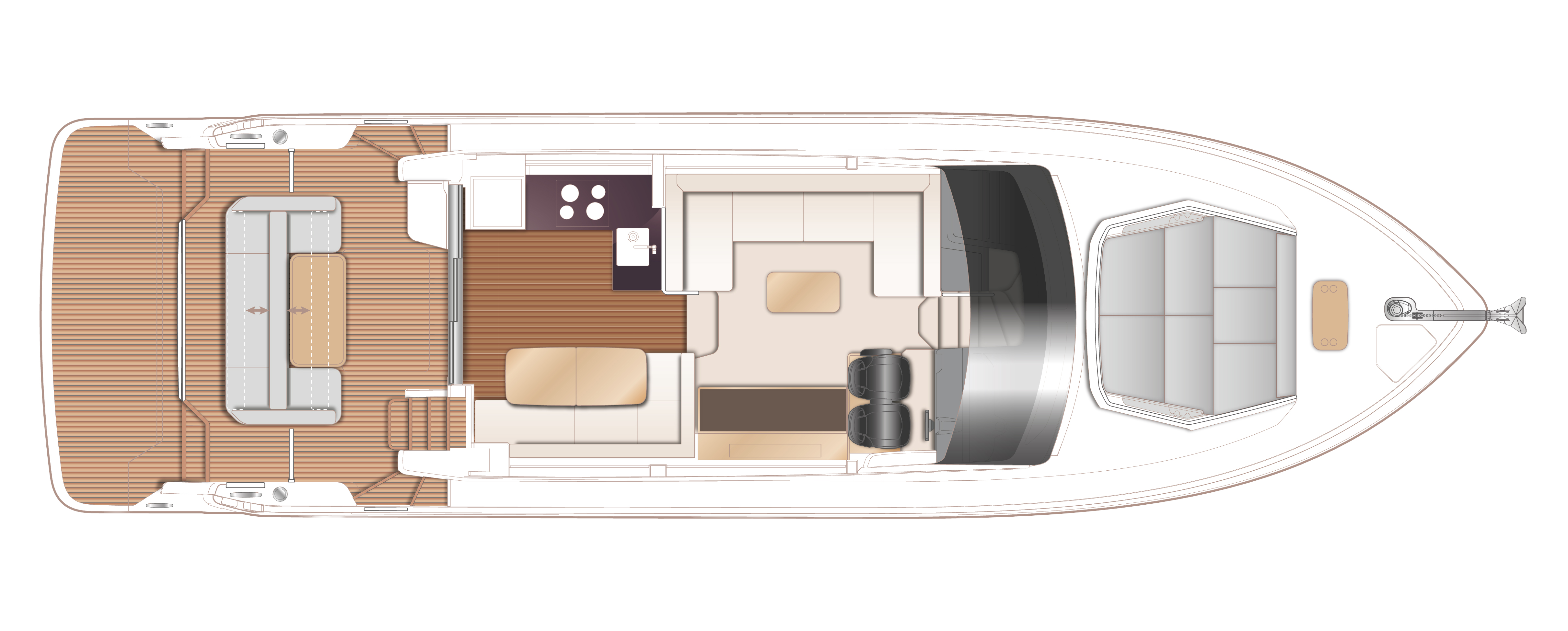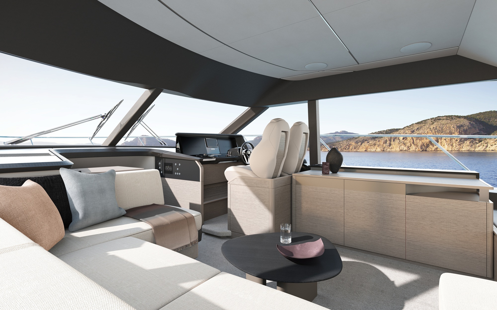 En la cubierta, un nuevo diseño envolvente de la bovedilla permite una distribución versátil de los asientos orientados a popa gracias a sus respaldos extraíbles para crear una experiencia social superior en el mar. El F54 es un espacio ideal para relajarse o socializar gracias a su diseño flexible para sentarse o tomar el sol en la cubierta de proa y su enorme puente superior.