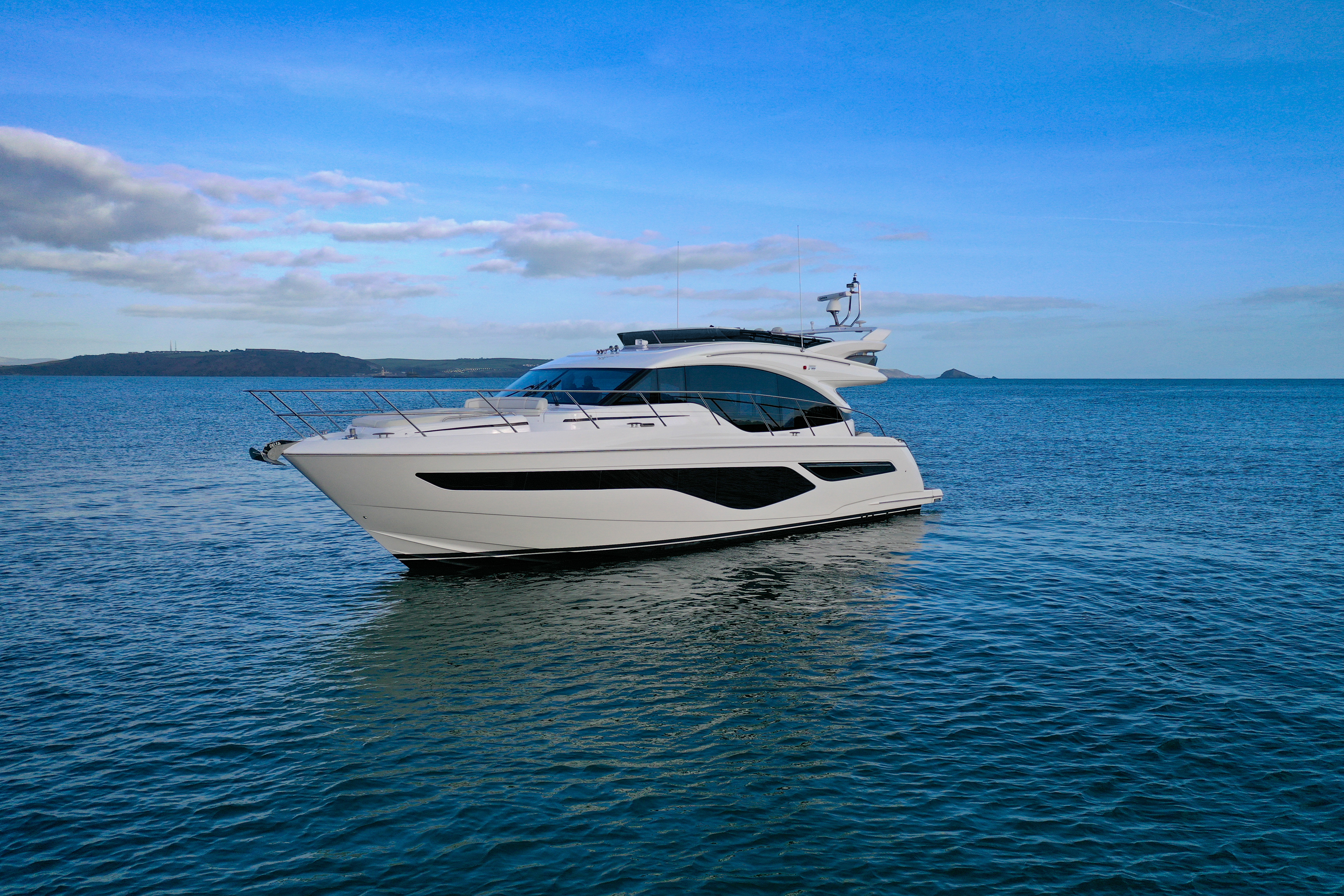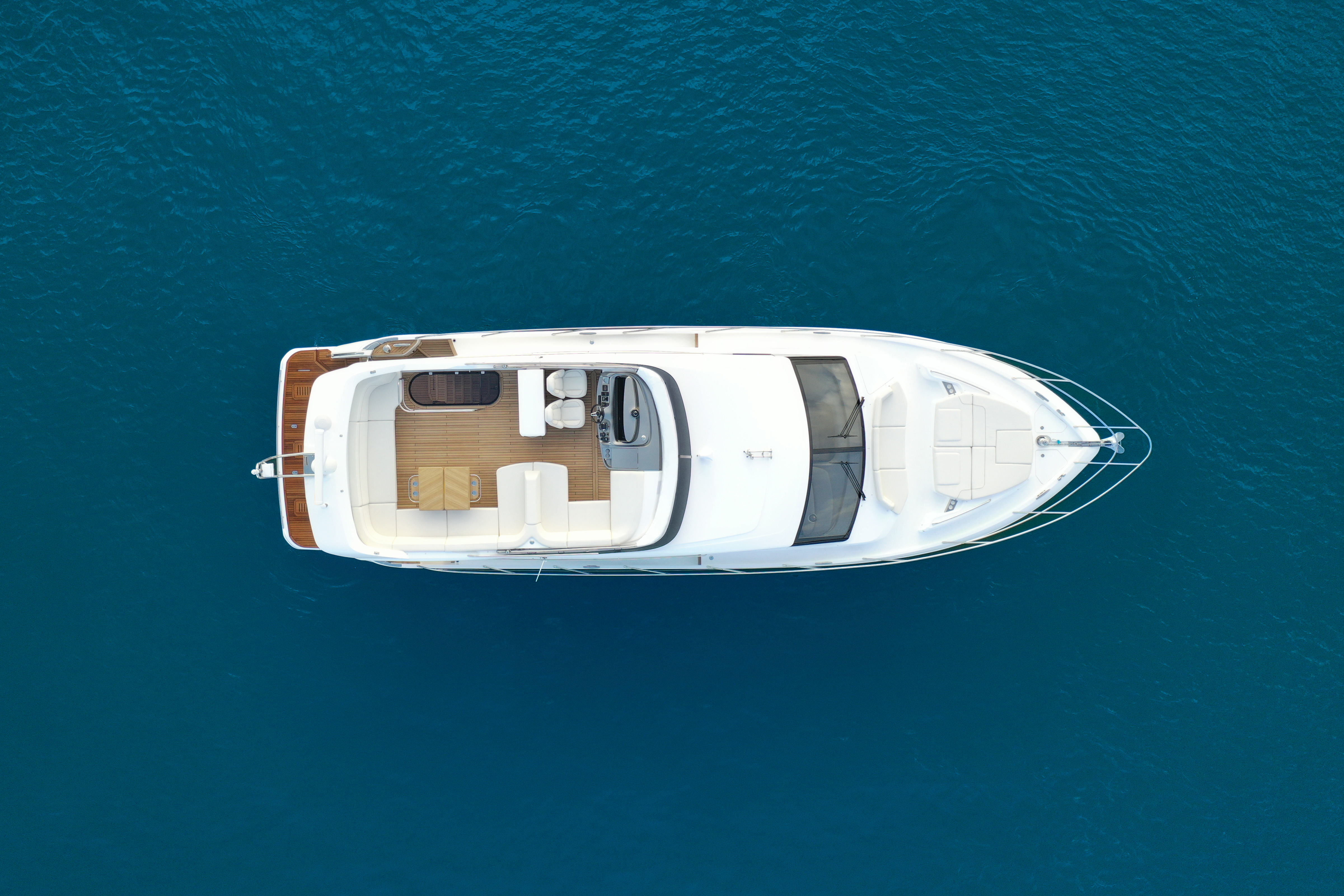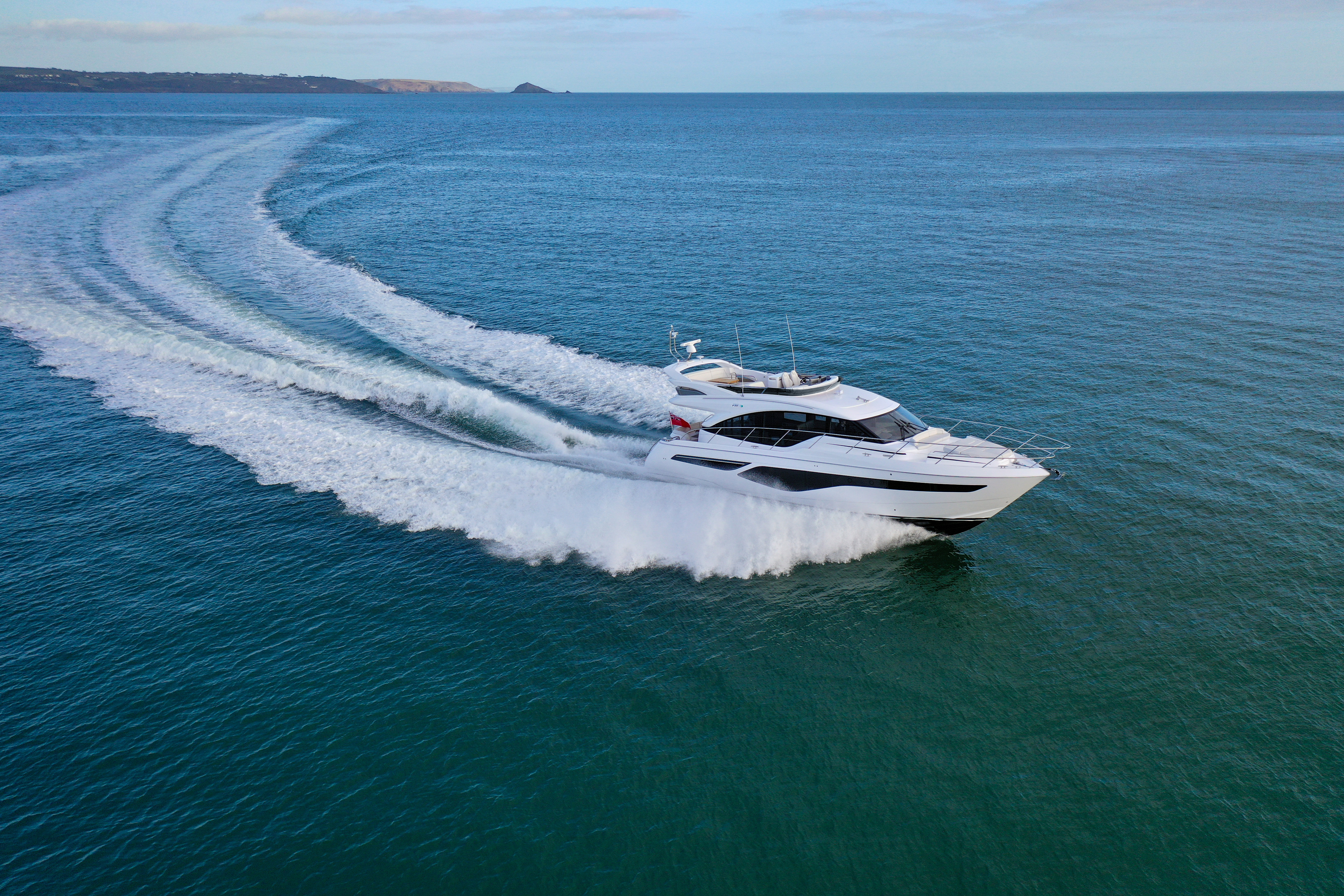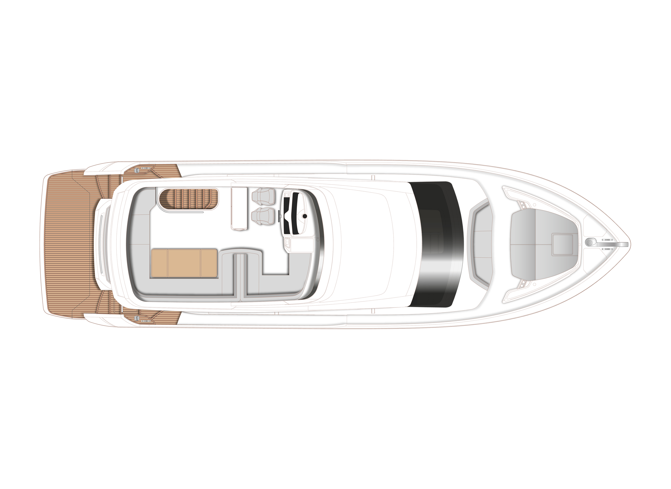 Con un casco de 17,7 m y dos motores Volvo D13-900 que alcanzan velocidades de 33 nudos, el F55 es un yate con puente superior de lujo que ofrece una navegación increíble y dinámica.