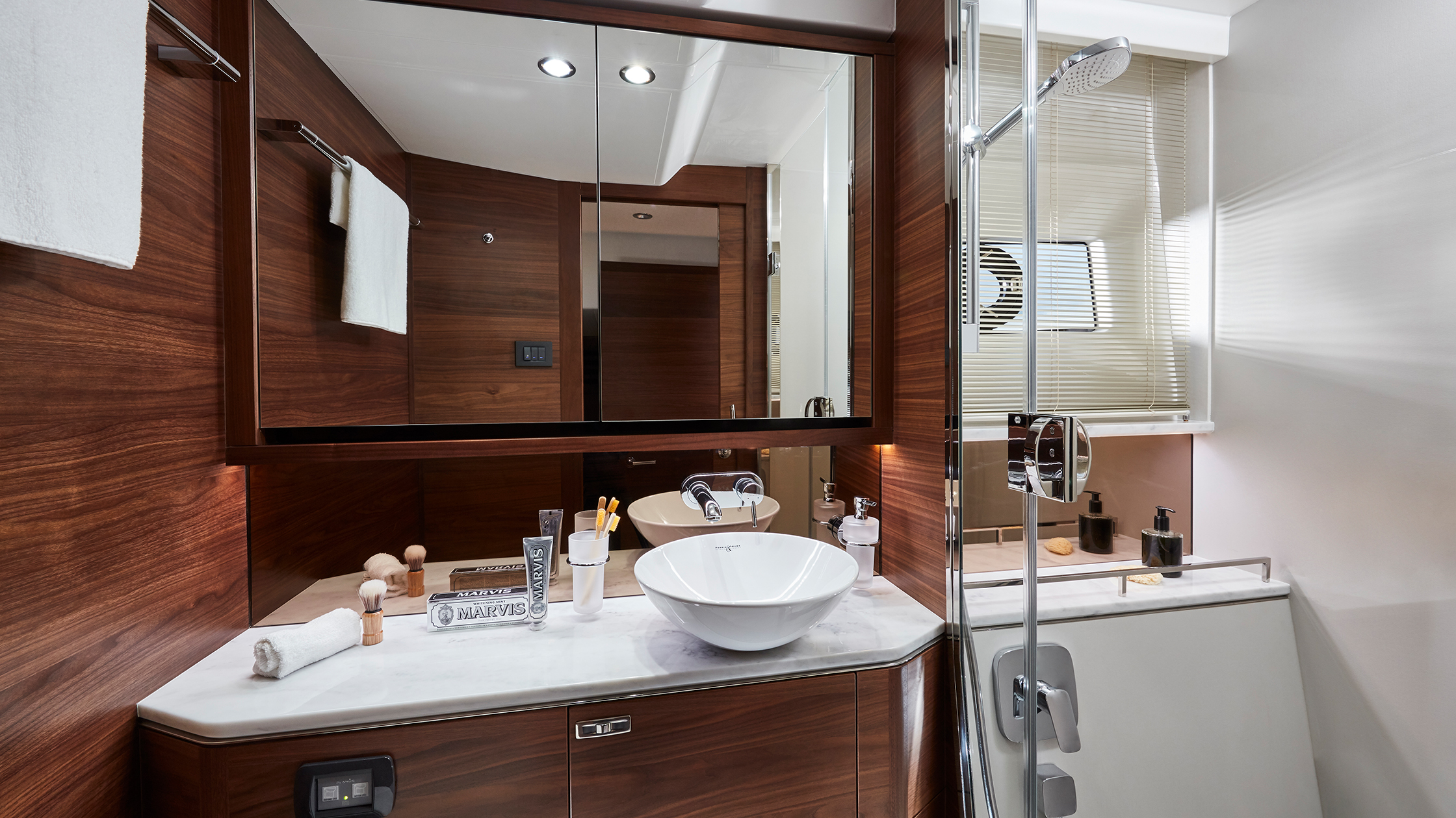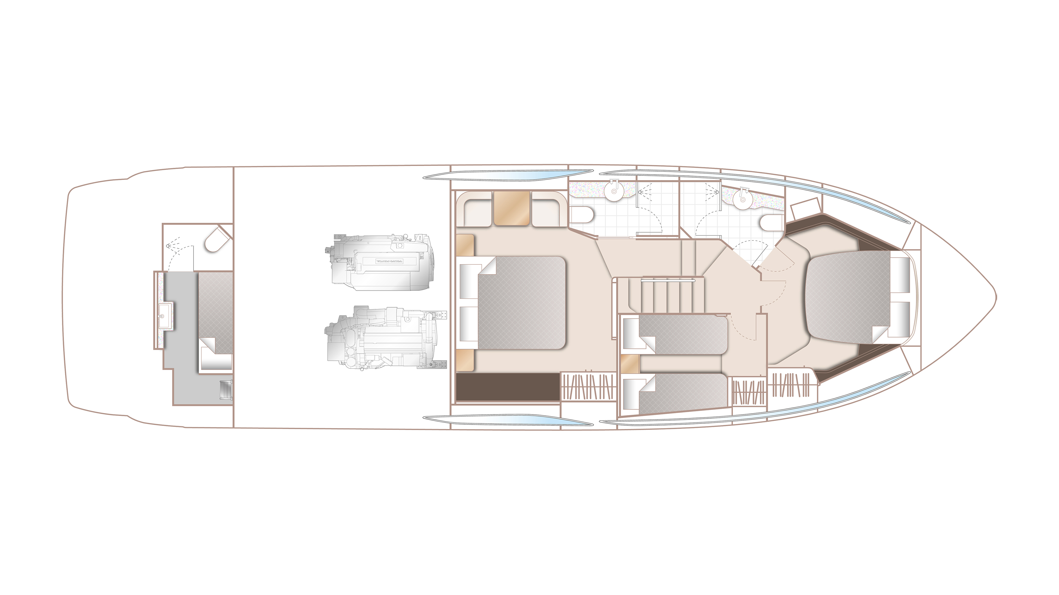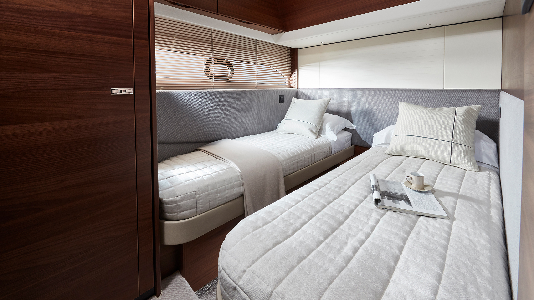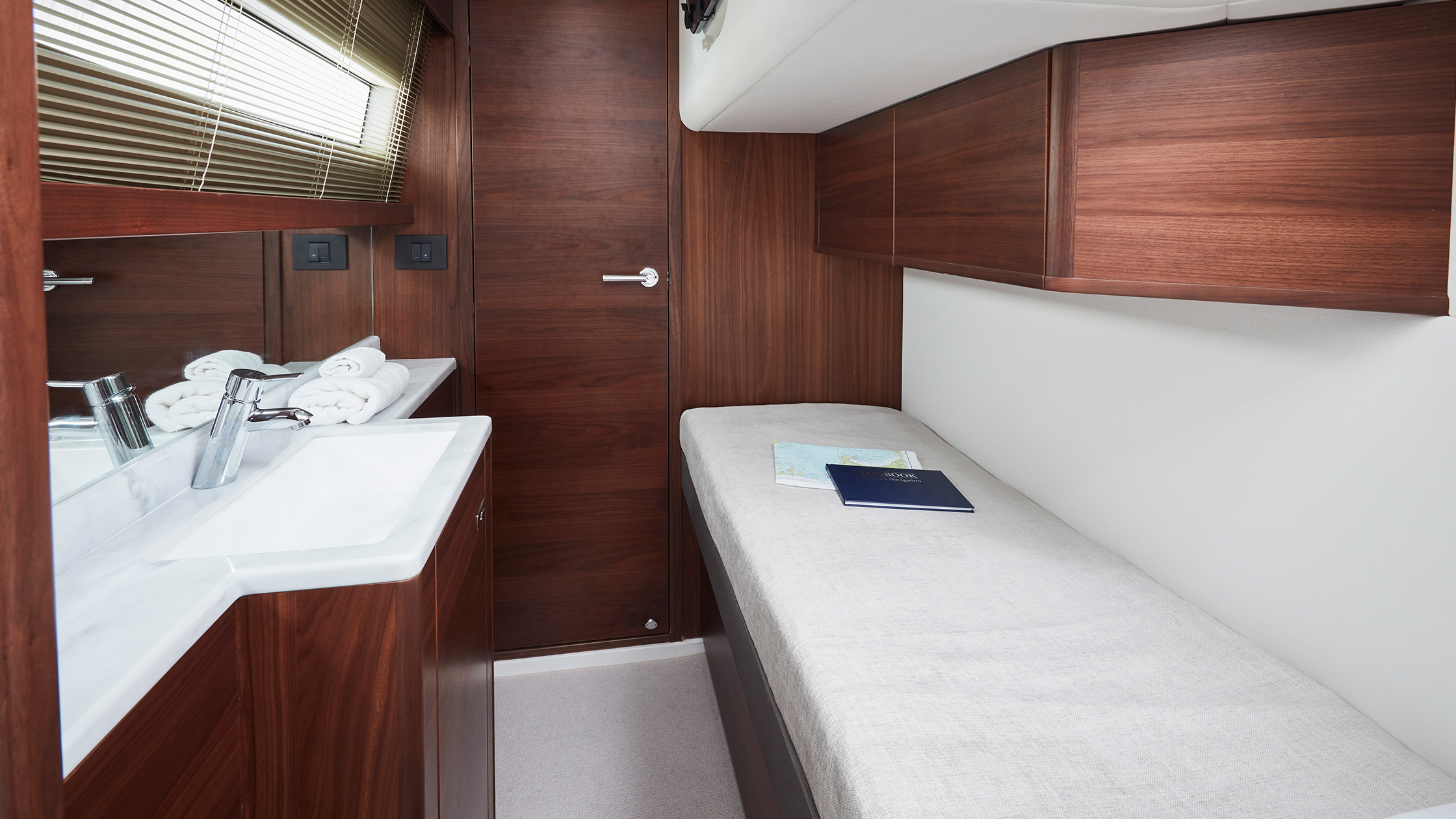 Bajo la cubierta, las enormes ventanas del casco inundan de luz las tres cabinas. Hay un camarote principal con tocador, zona de desayuno y baño en suite, una cabina de proa para invitados con cama de matrimonio y una cabina de estribor con dos camas individuales y la opción de convertirlas en una cama de matrimonio. Una cabina de popa individual opcional con baño en suite y armario es ideal para la tripulación.