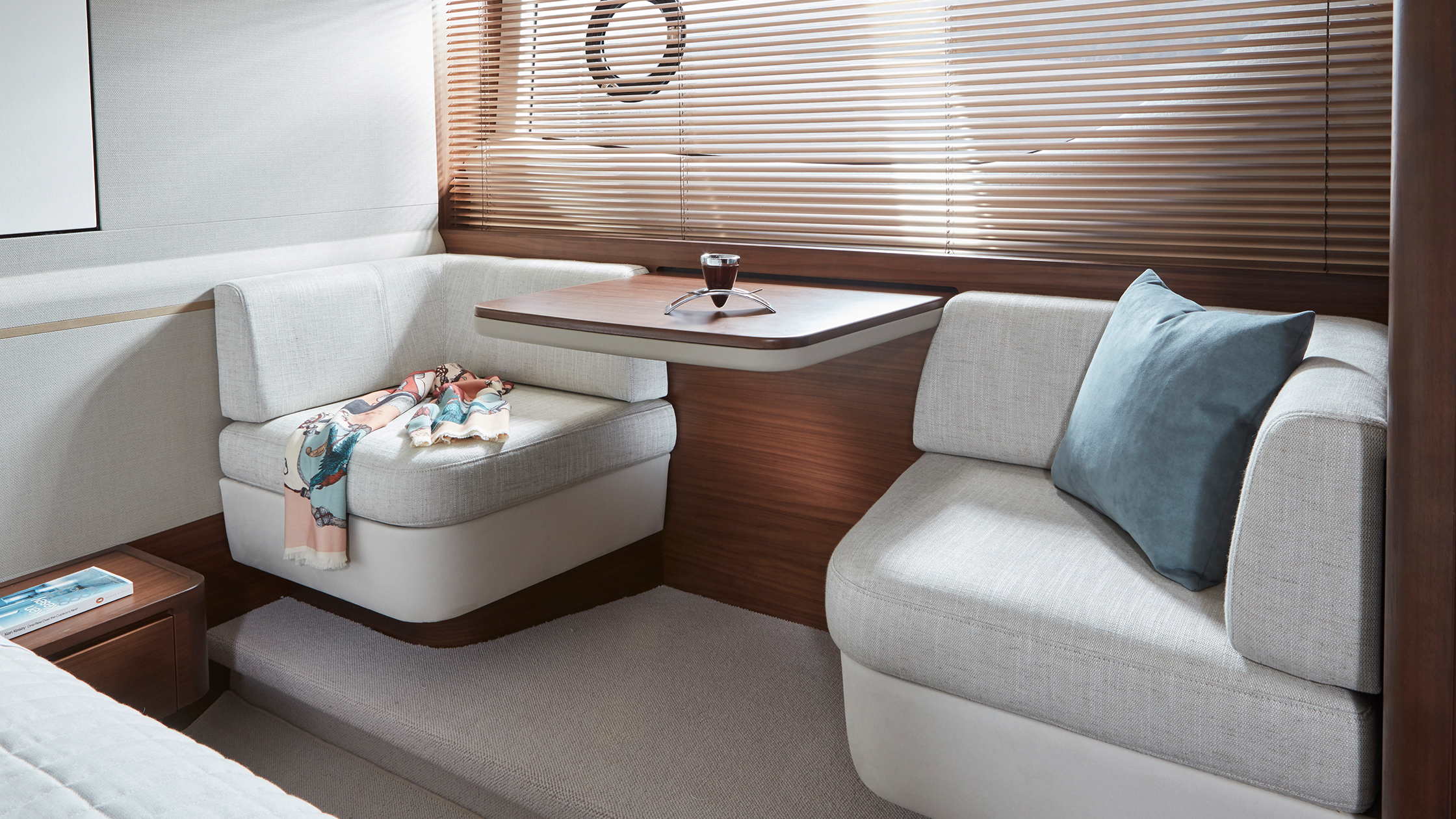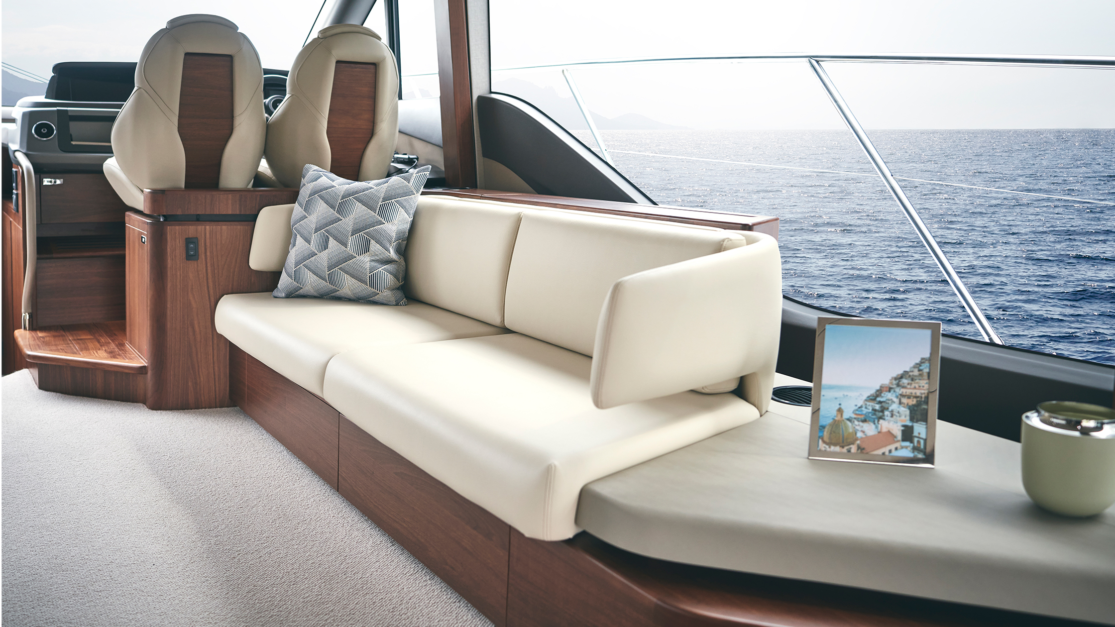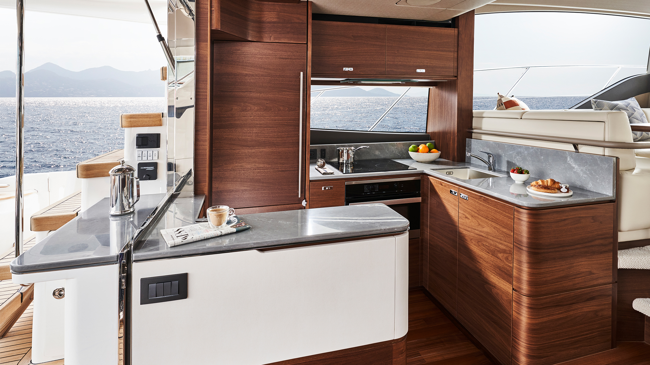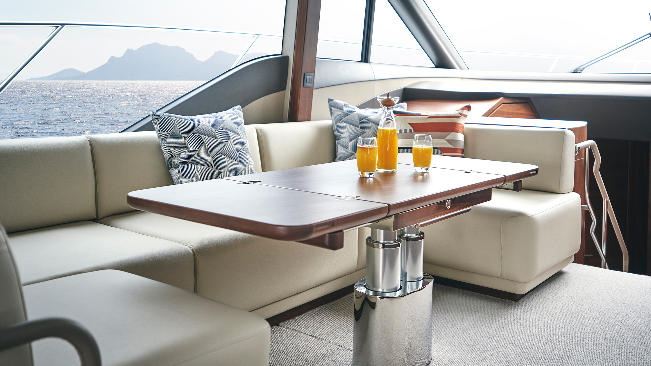 Al igual que otros yates más grandes de la gama, el mostrador de la bañera se conecta con la cocina, integrando a la perfección las dos zonas de ocio. El enorme espacio del salón en la cubierta principal se acentúa gracias a las enormes ventanas, la sutil iluminación decorativa y los detalles cosidos a mano. Un moderno sofá en forma de U y una mesa de comedor/auxiliar convertible crean el entorno ideal para pasar tiempo con los seres queridos.