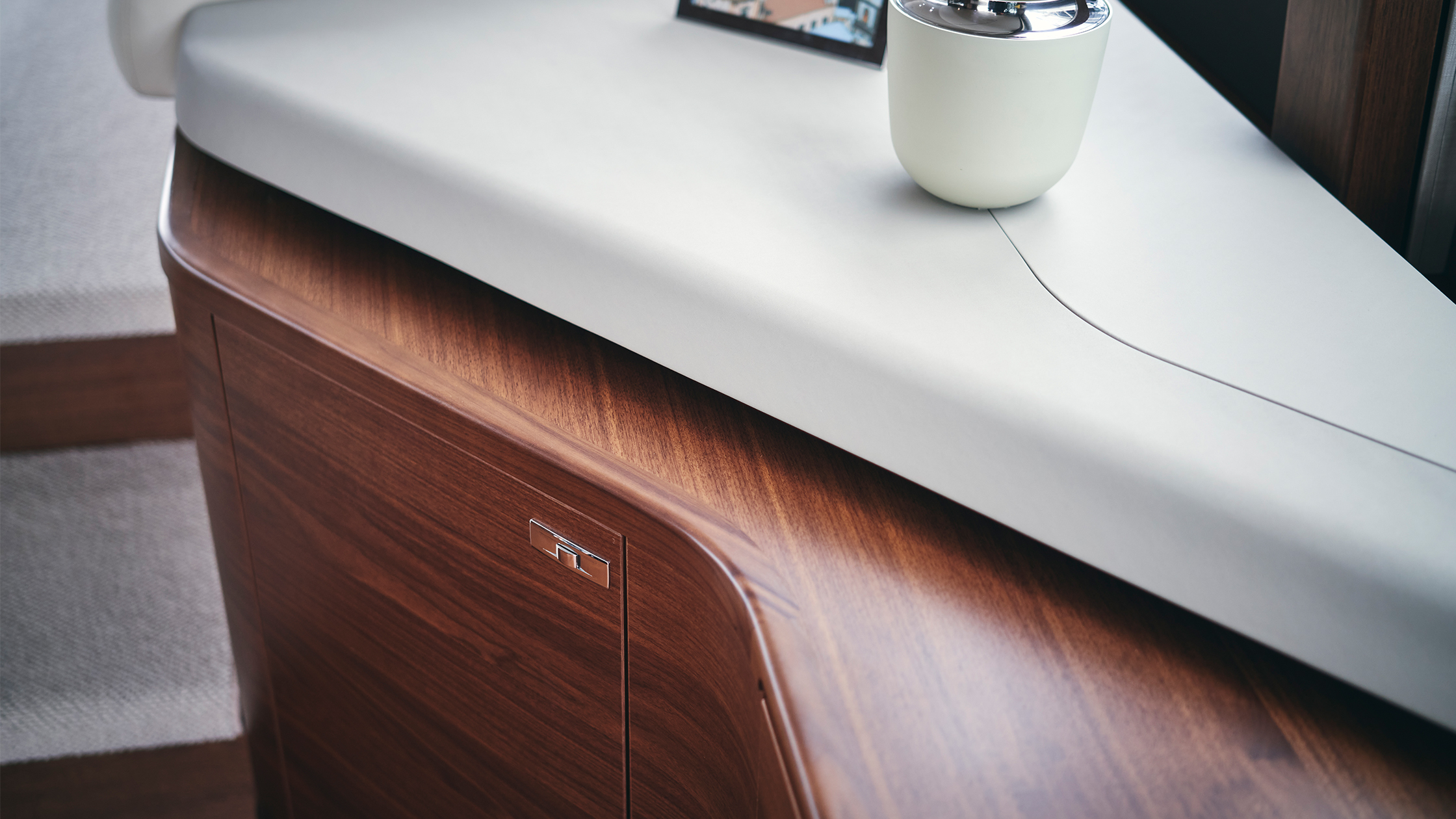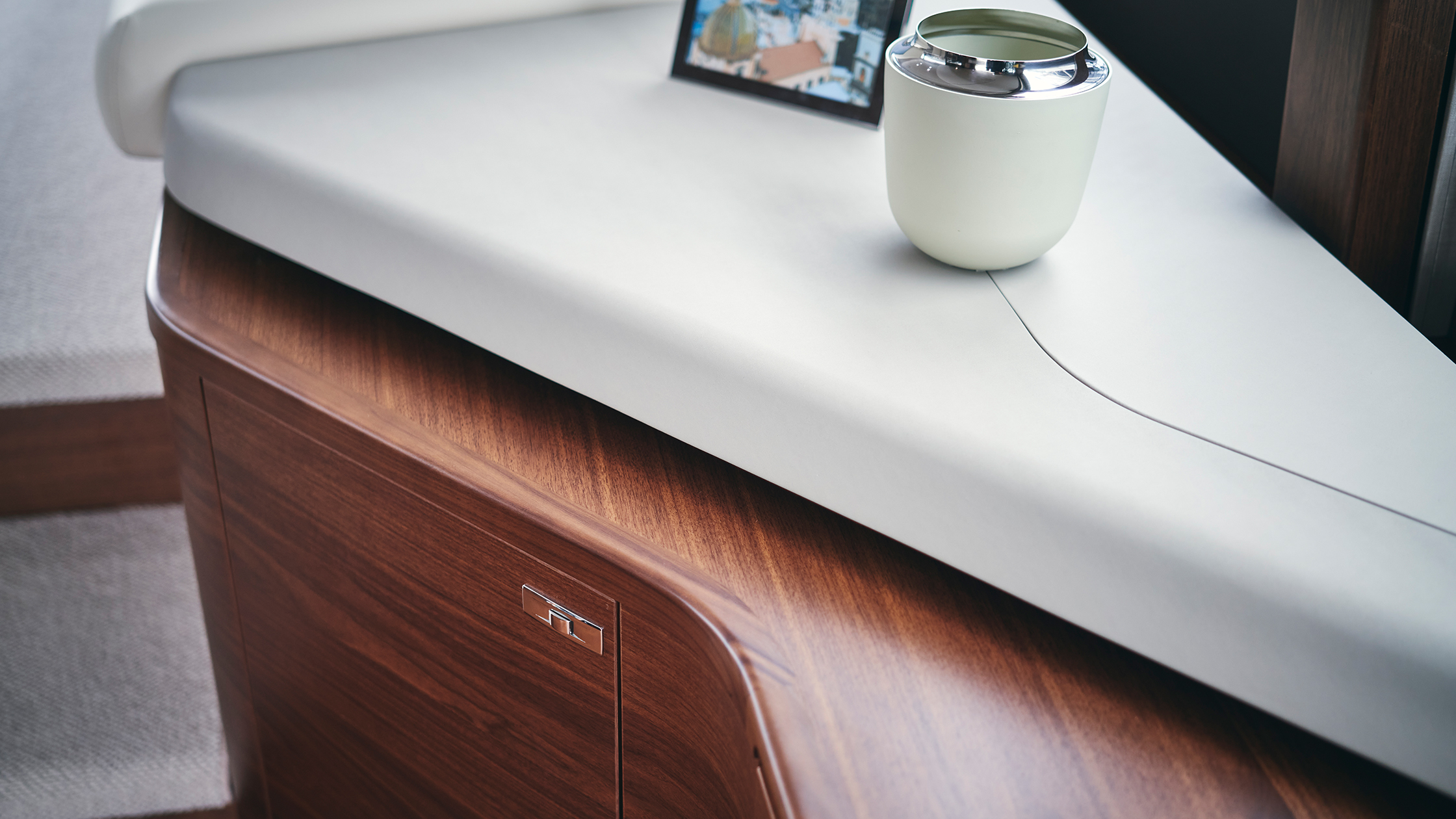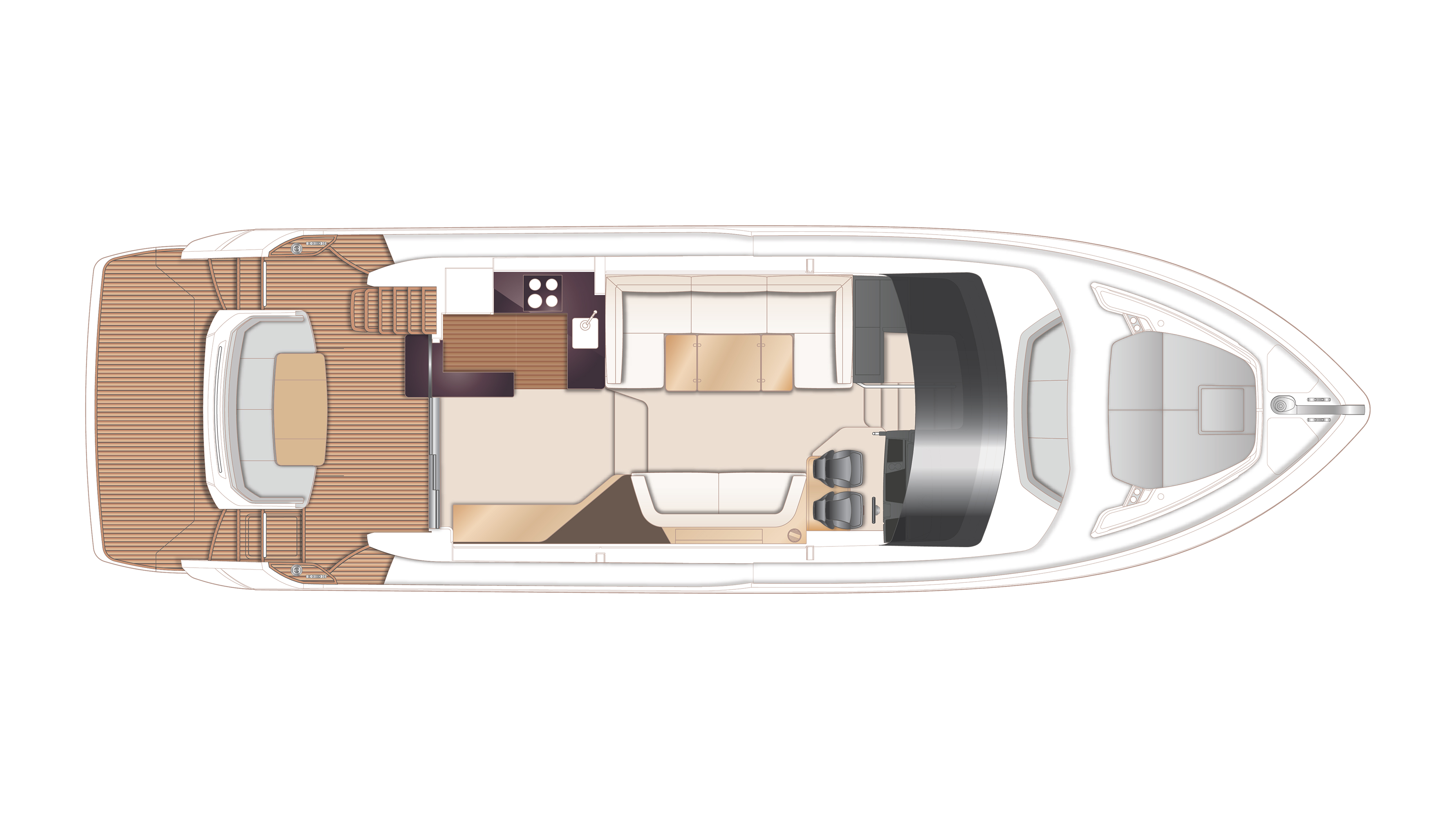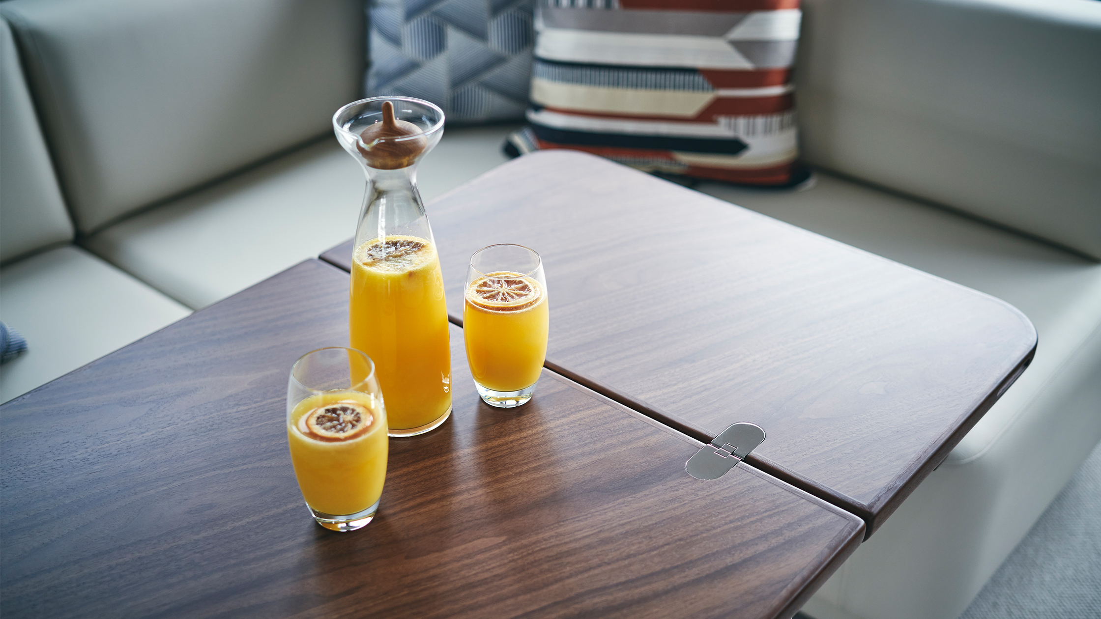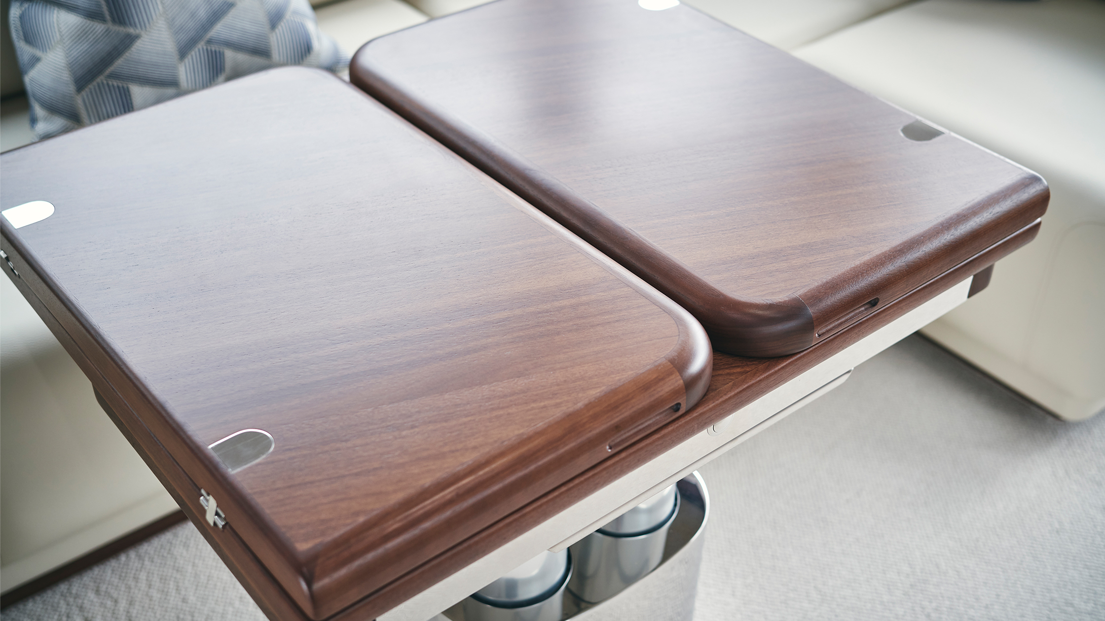 Al igual que otros yates más grandes de la gama, el mostrador de la bañera se conecta con la cocina, integrando a la perfección las dos zonas de ocio. El enorme espacio del salón en la cubierta principal se acentúa gracias a las enormes ventanas, la sutil iluminación decorativa y los detalles cosidos a mano. Un moderno sofá en forma de U y una mesa de comedor/auxiliar convertible crean el entorno ideal para pasar tiempo con los seres queridos.