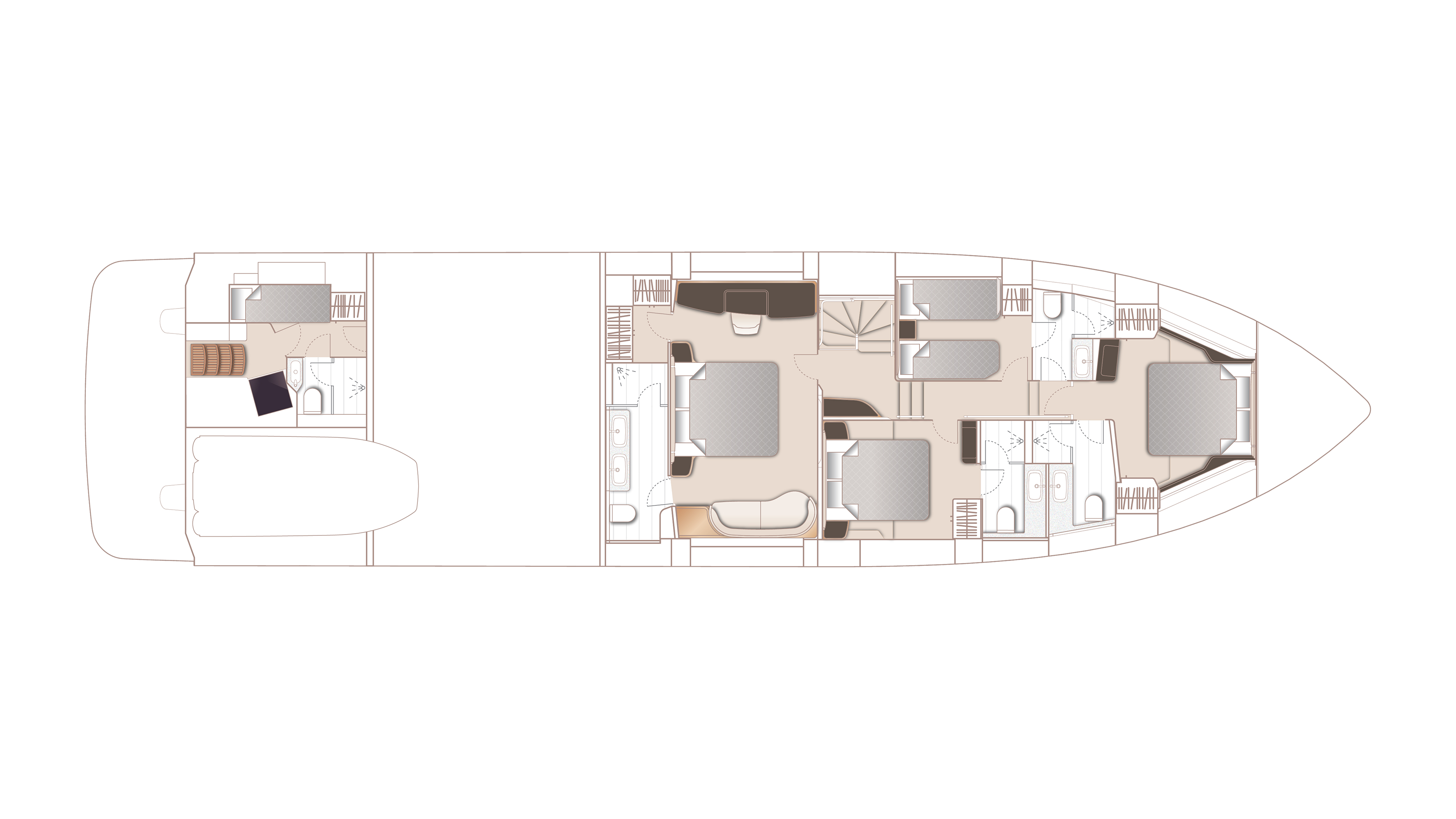 Bajo la cubierta, ocho huéspedes pueden descansar en cuatro cabinas con baño en suite, una equipación formidable y la luz natural que llega del elegante acristalamiento del casco. Además, hay una cabina de popa con dos camas individuales para huéspedes ocasionales o para la tripulación. Una escalera sale de la cubierta principal y llega al camarote principal de manga completa en el centro del barco, pasando por un vestíbulo privado en la escalerilla inferior.