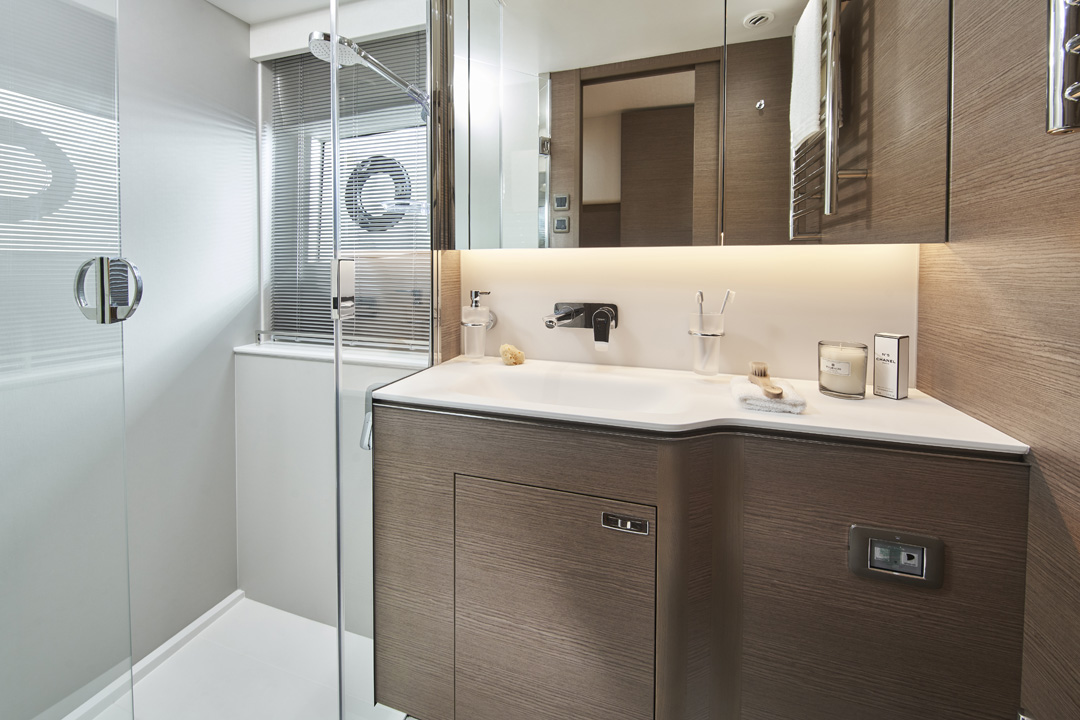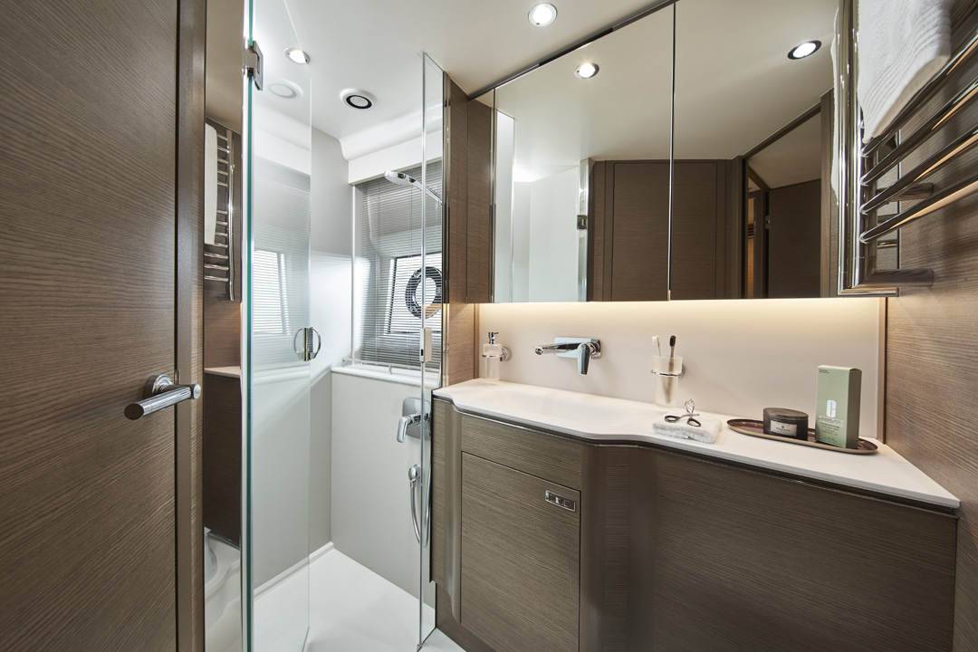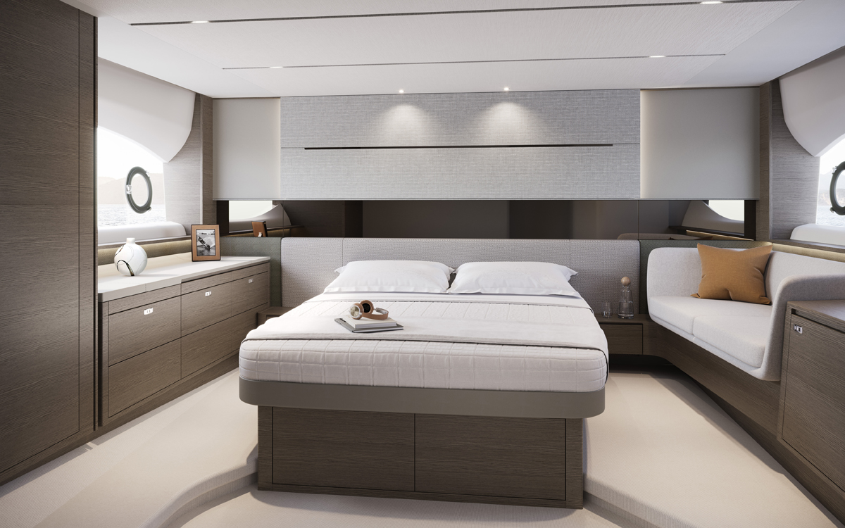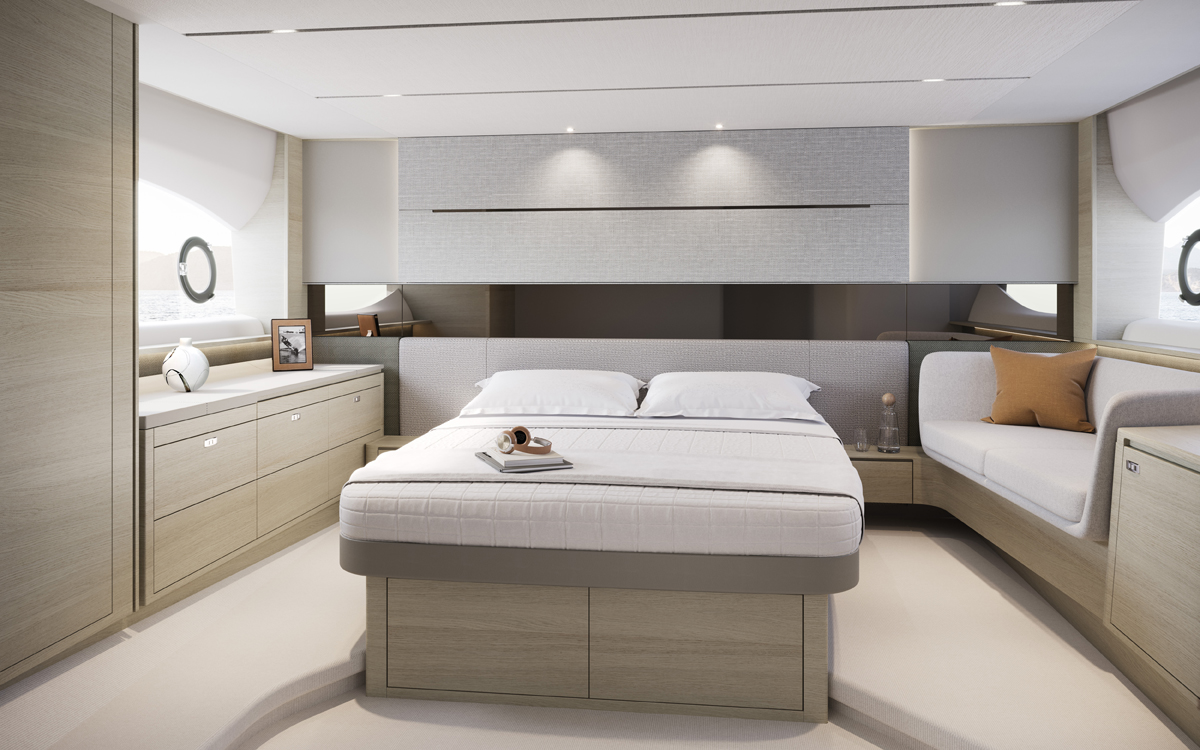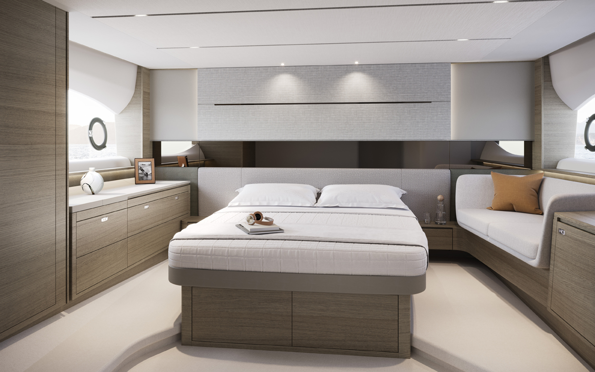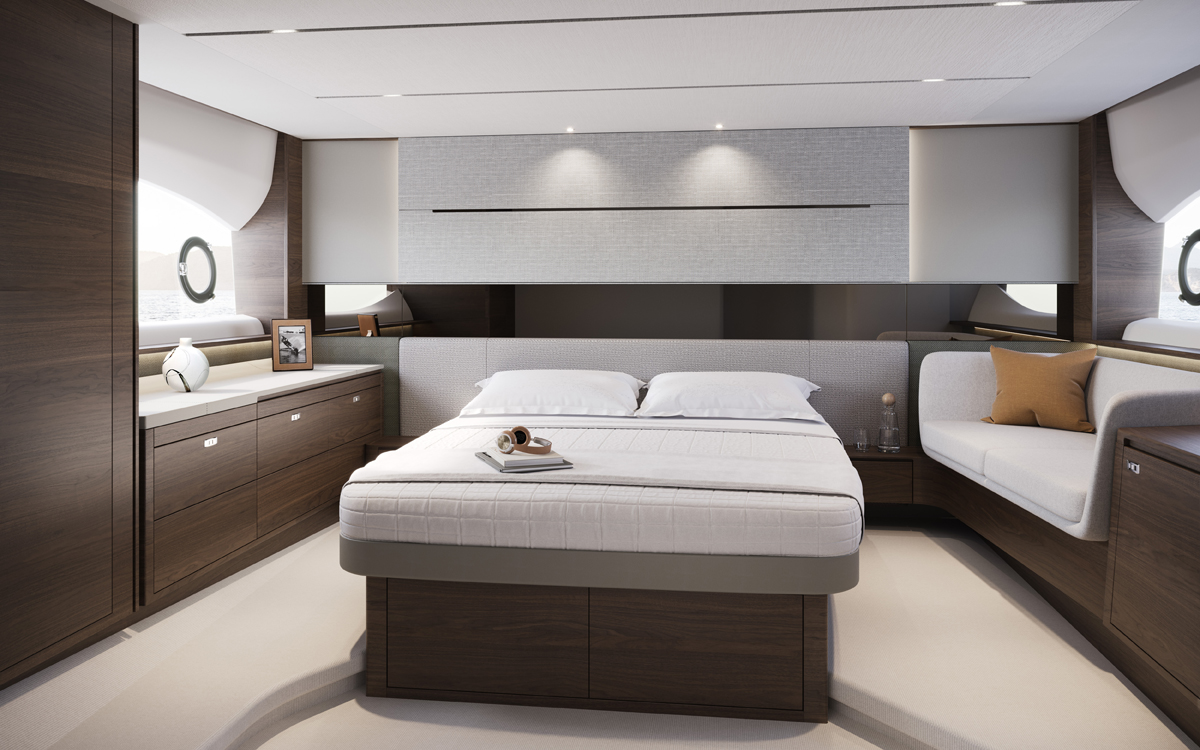 La cubierta principal también posee una tumbona amplia situada detrás de la bañera y otra zona para sentarse y tomar el sol en la zona de proa. Y con una velocidad máxima de 35 nudos, puede disfrutar de una experiencia superior de yate deportivo.
