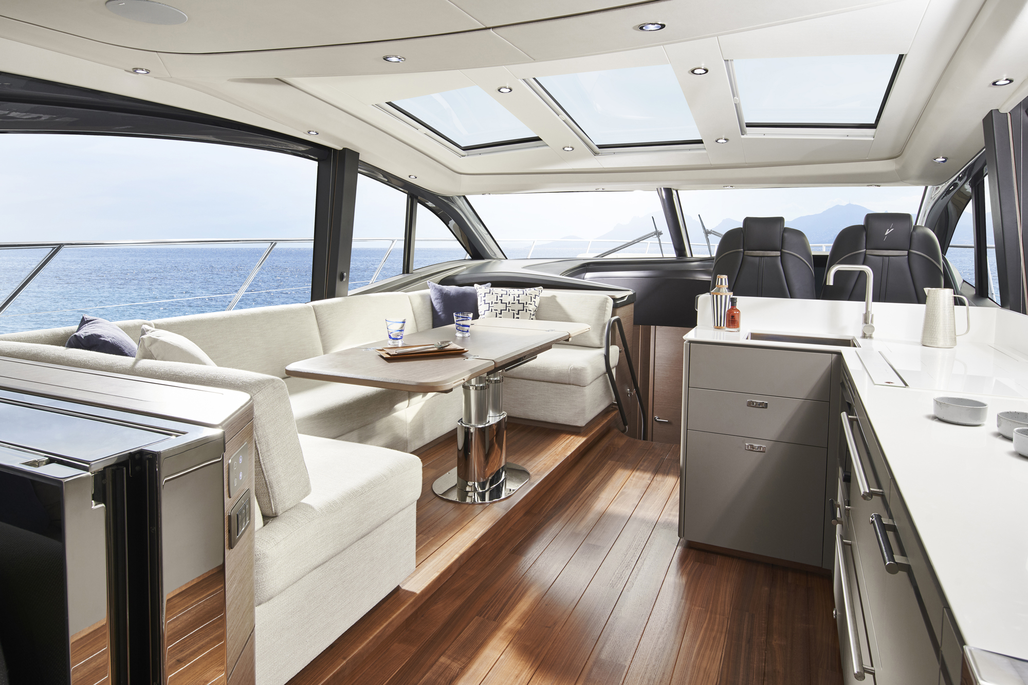 La cubierta principal del V55 ha sido diseñada pensando en quienes aprecian una navegación abierta. La enorme bañera dispone de una amplia zona de asientos en forma de L y asientos adicionales de popa alrededor de una mesa plegable de teca, acompañada por un bar con fregadero que incluye una barbacoa eléctrica.