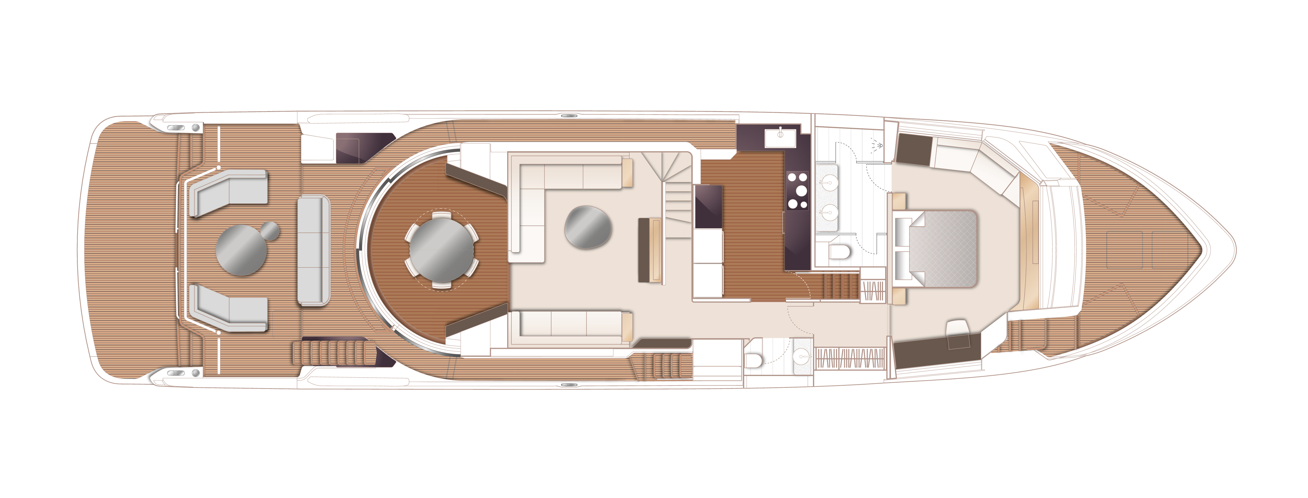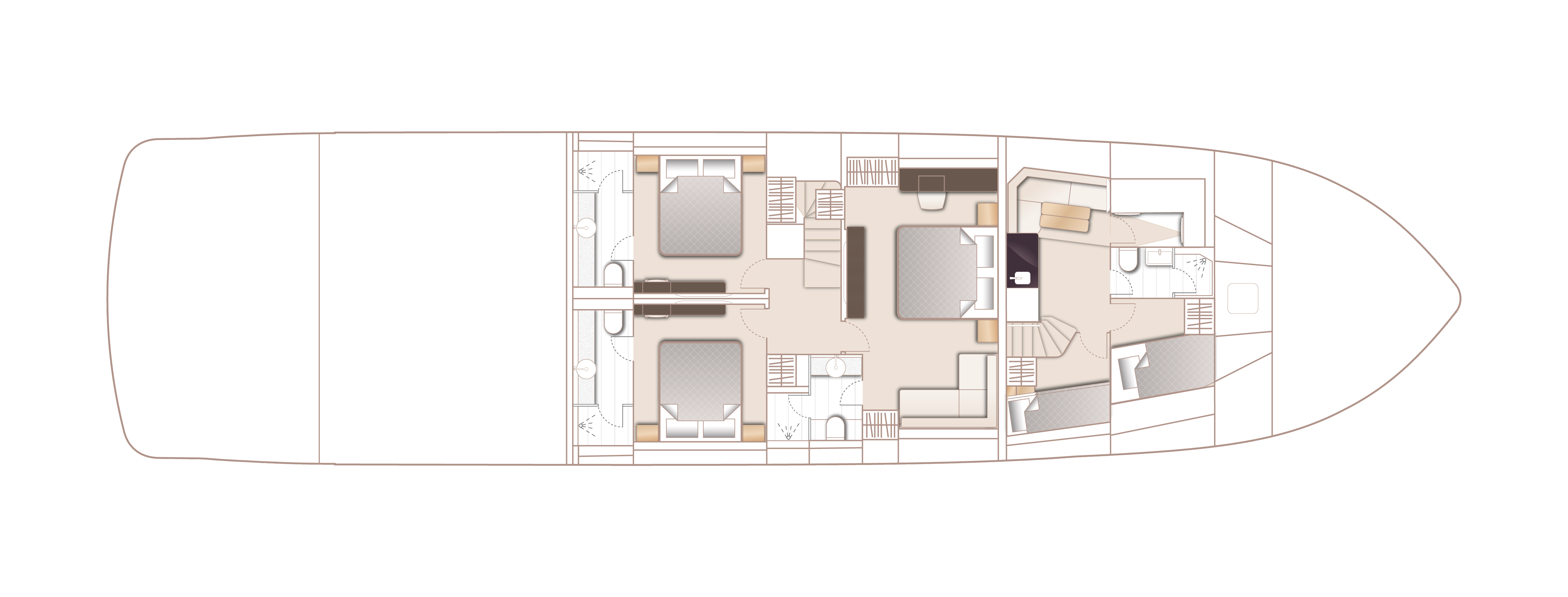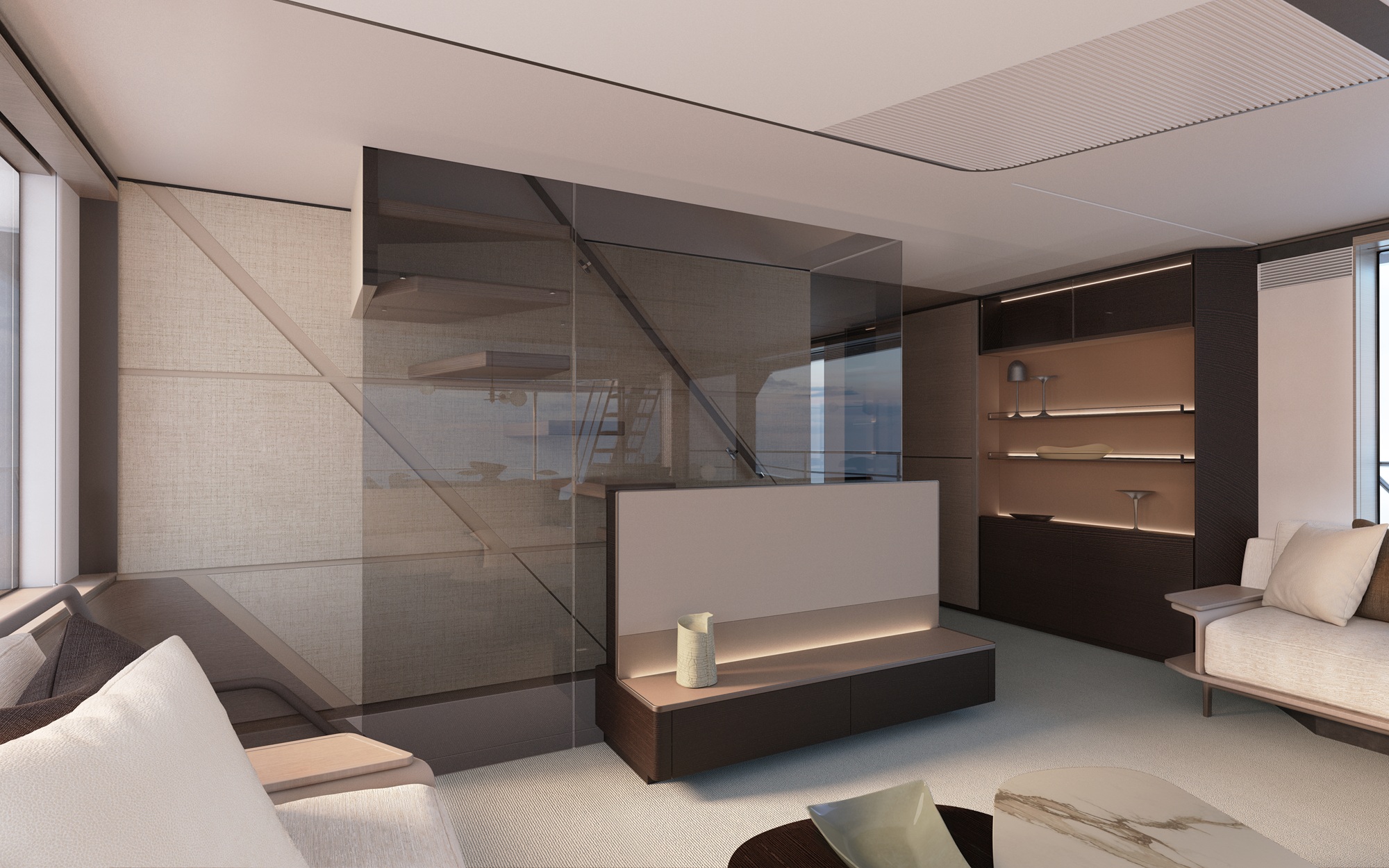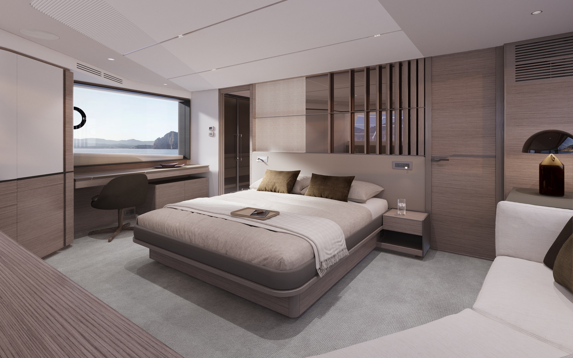 La suite principal se encuentra delante de la cubierta principal, lo que la dota de unas vistas espectaculares, con la opción de una puerta tipo ala de gaviota que da acceso privado a la terraza de proa, un espacio ideal para disfrutar de un café por la mañana. El alojamiento para invitados incluye tres o cuatro cabinas con cama de matrimonio y baño en suite bajo cubierta, mientras que la tripulación dispone de un máximo de tres cabinas, un baño y una zona de la tripulación.