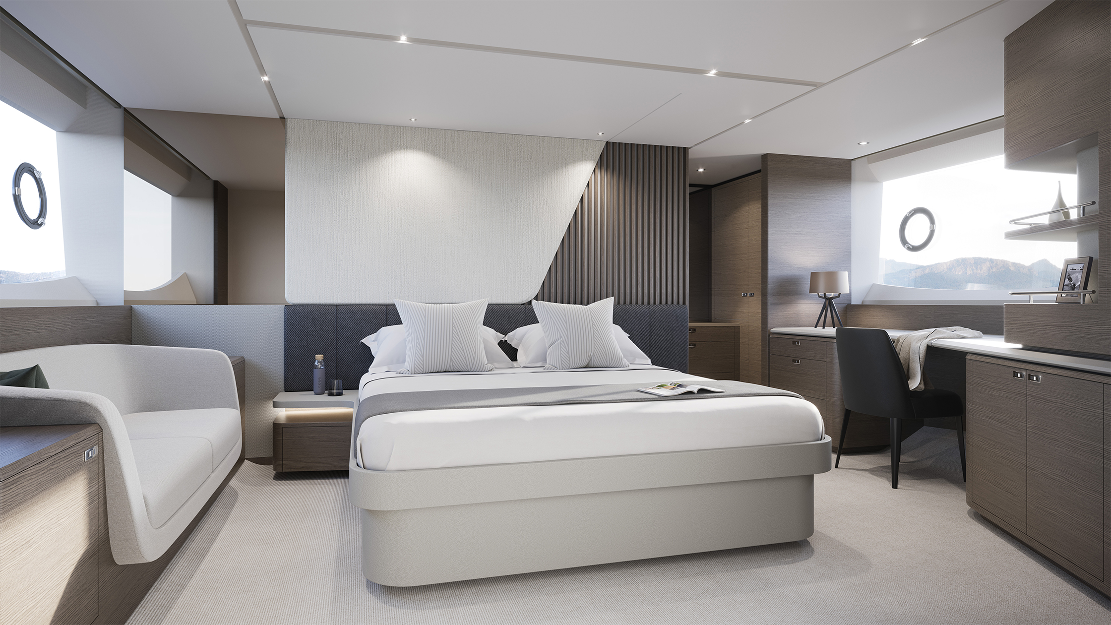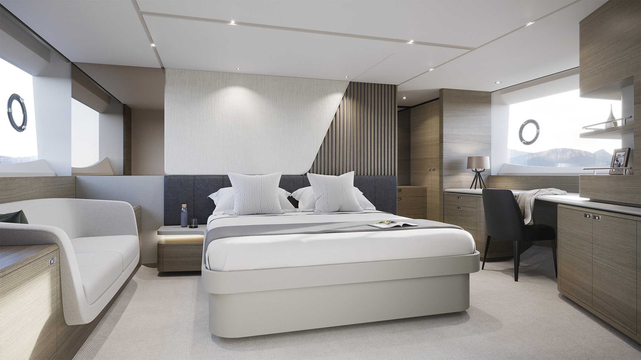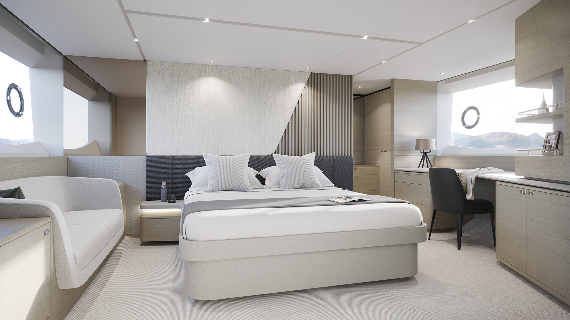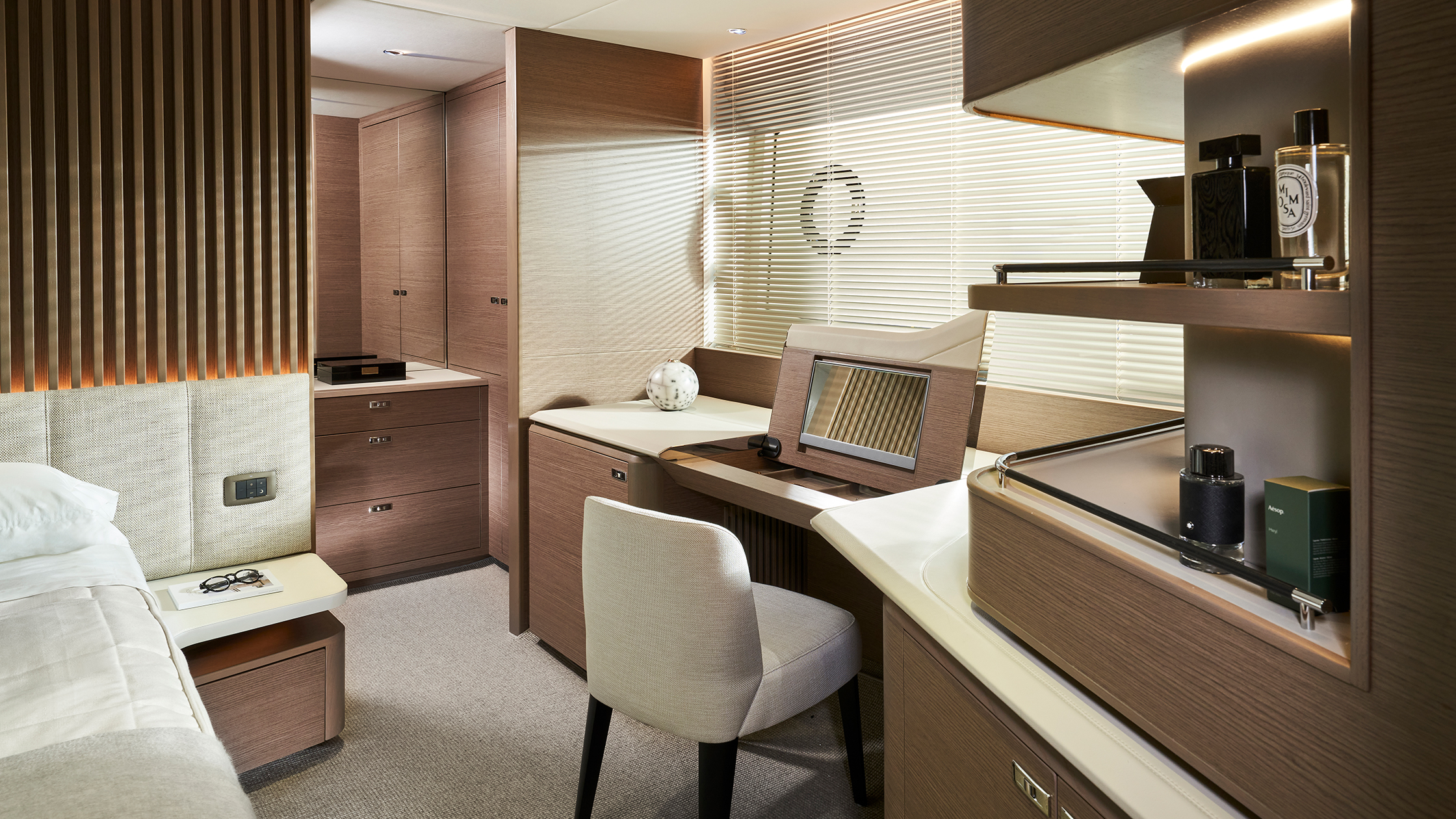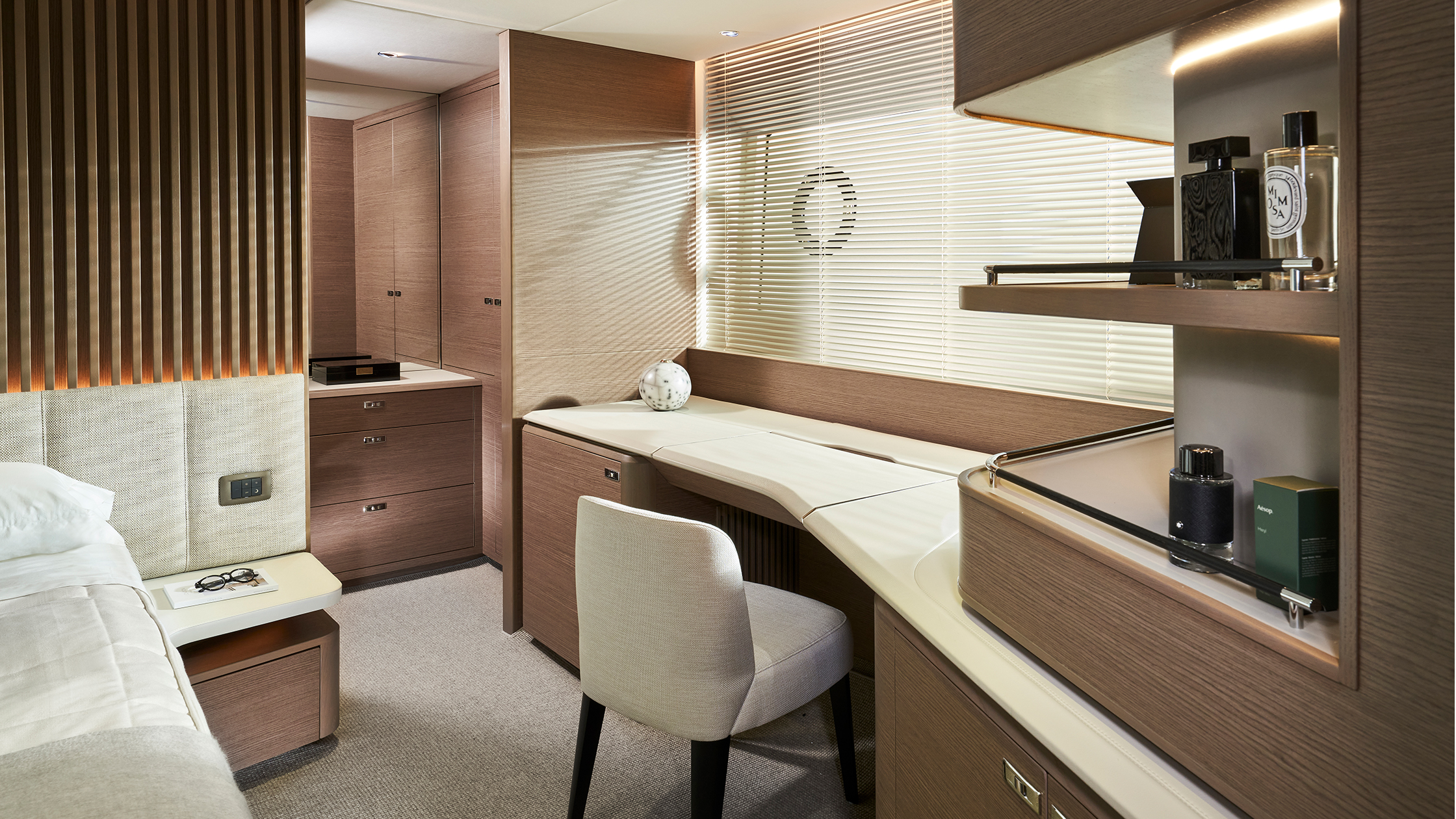 El camarote principal de manga completa se distingue por un diseño refinado gracias a los paneles de inspiración arquitectónica, revestimientos de refrescante lino para la pared, un espejo de tono bronce y un tocador tapizado de cuero Livorno Stone. Posee su propia escalera que conduce a la cubierta principal a través de un vestíbulo privado que da al salón.
