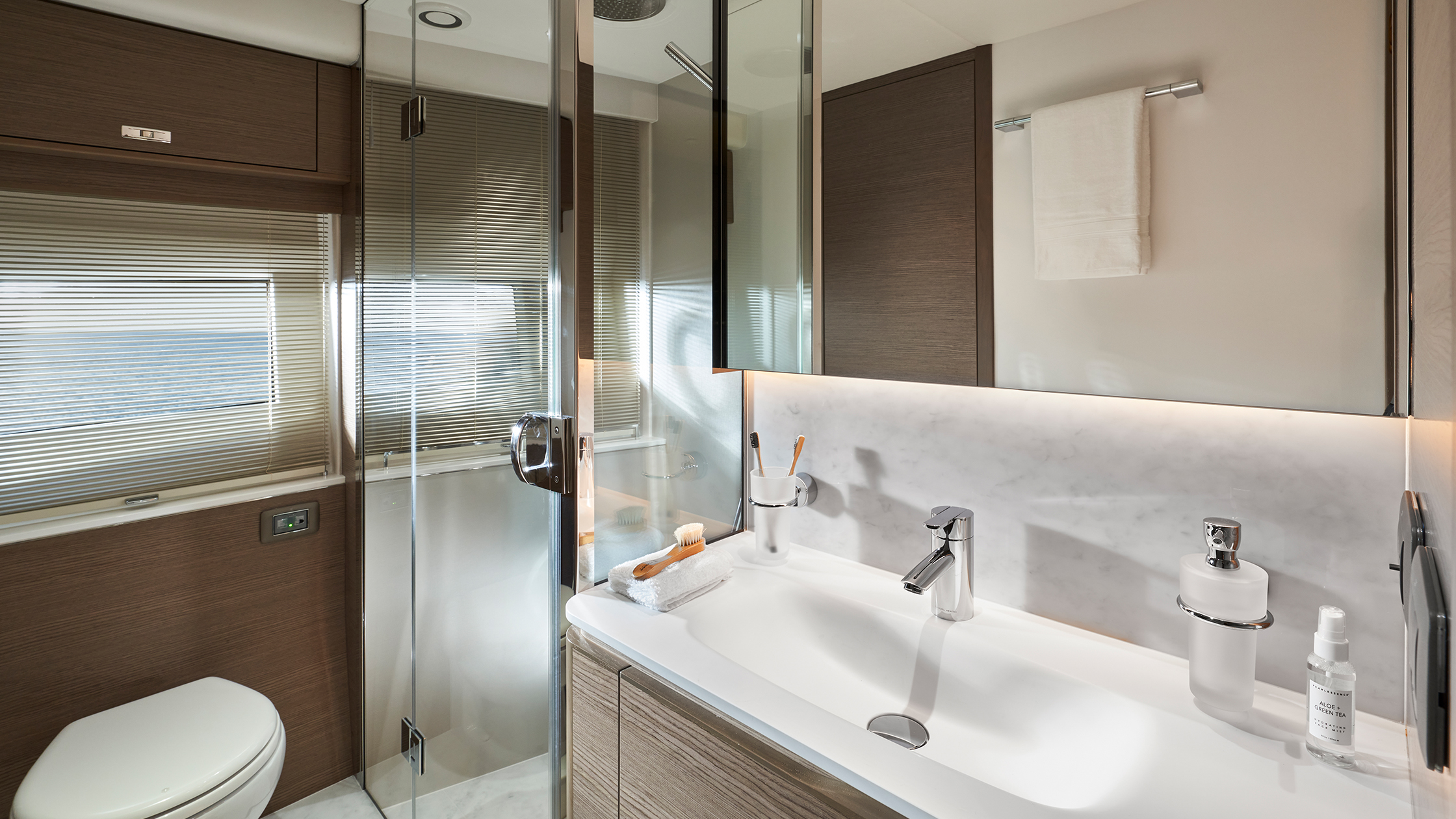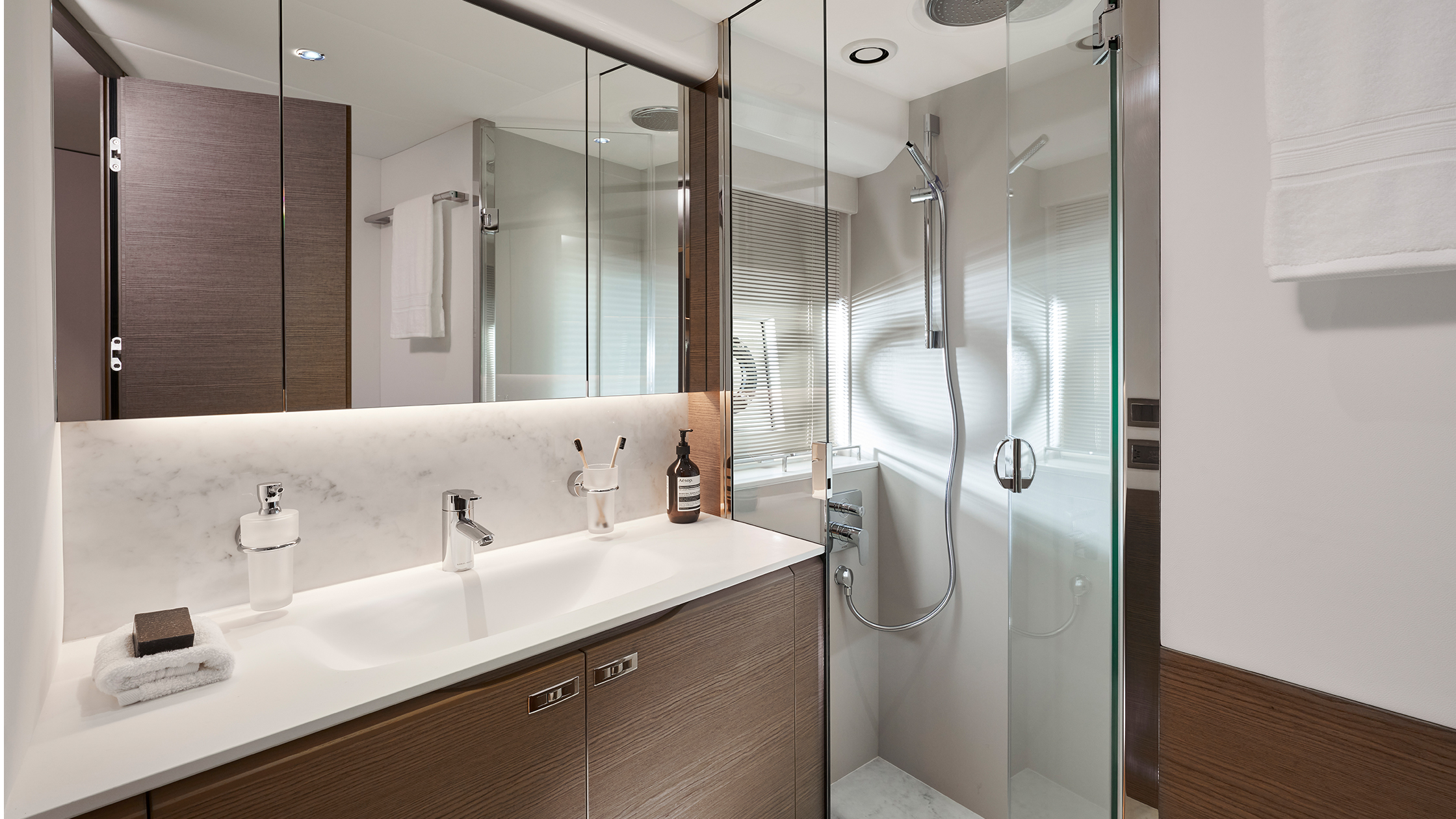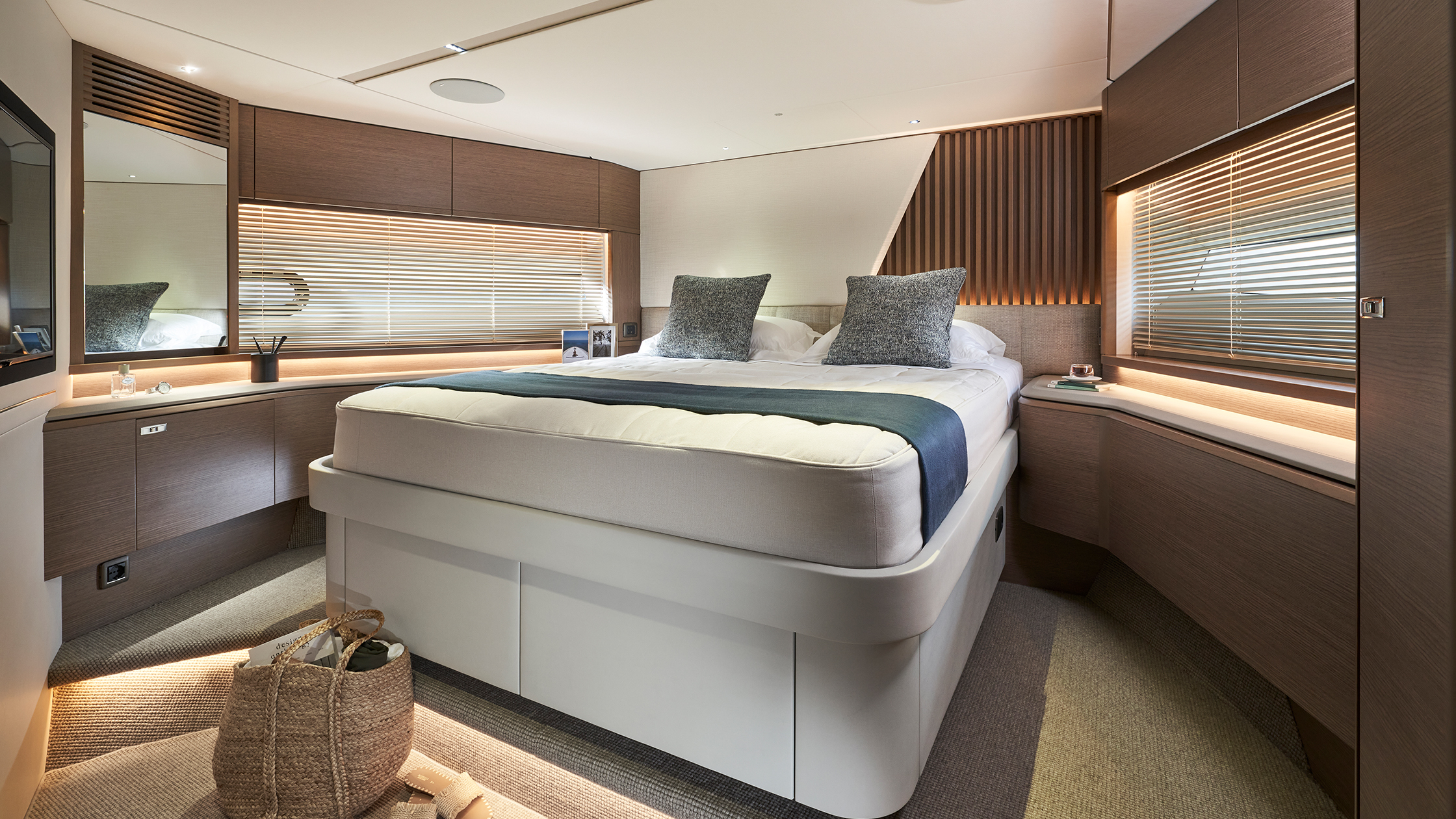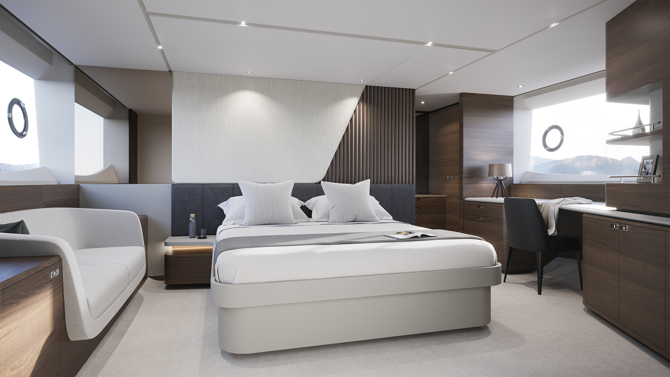El camarote principal de manga completa se distingue por un diseño refinado gracias a los paneles de inspiración arquitectónica, revestimientos de refrescante lino para la pared, un espejo de tono bronce y un tocador tapizado de cuero Livorno Stone. Posee su propia escalera que conduce a la cubierta principal a través de un vestíbulo privado que da al salón.