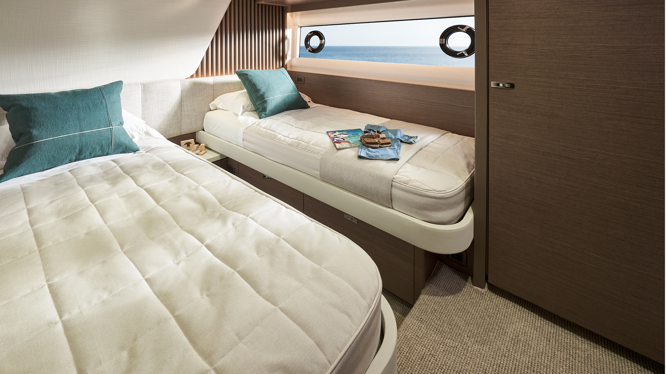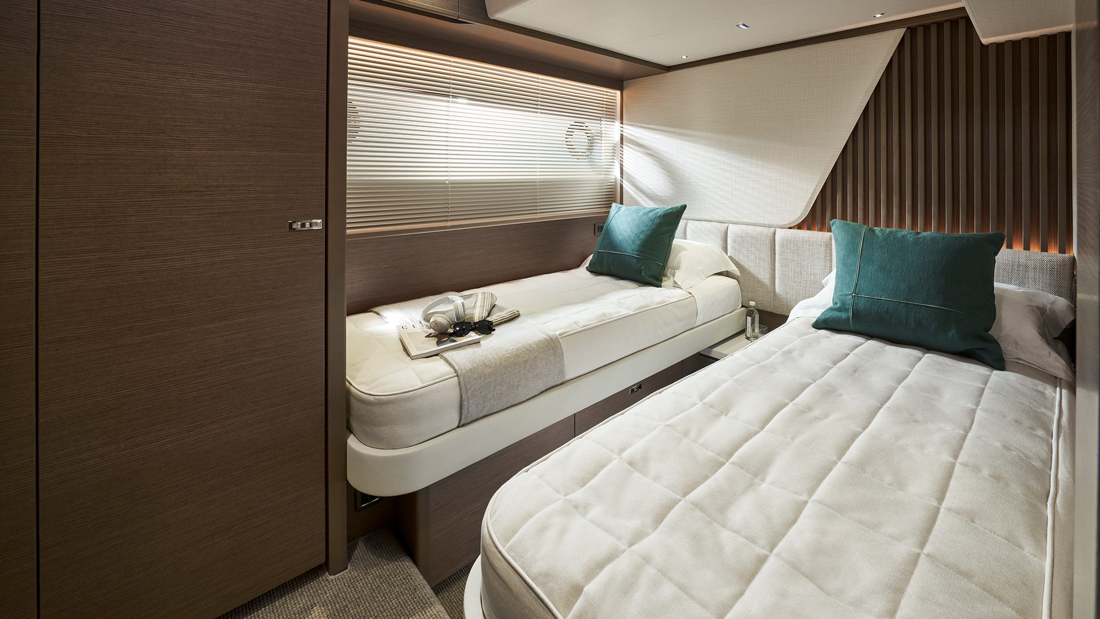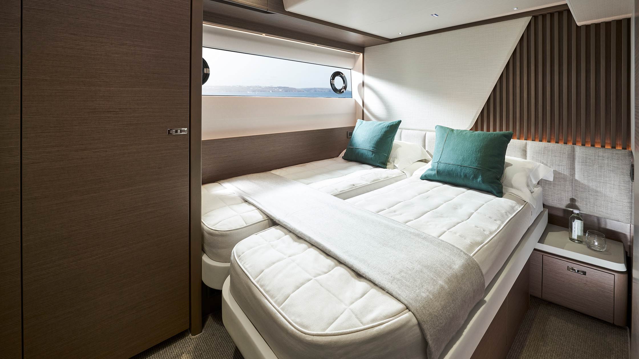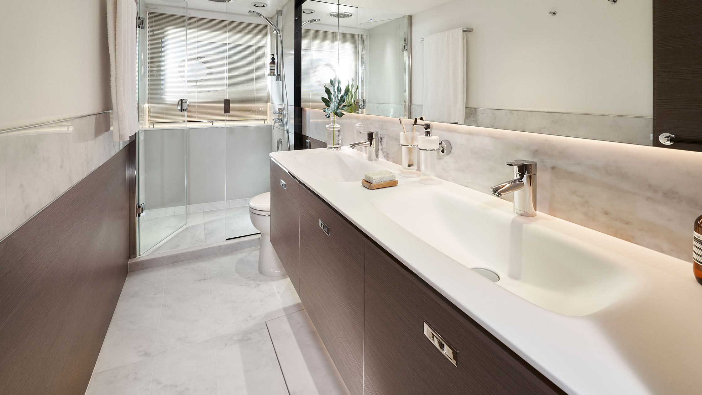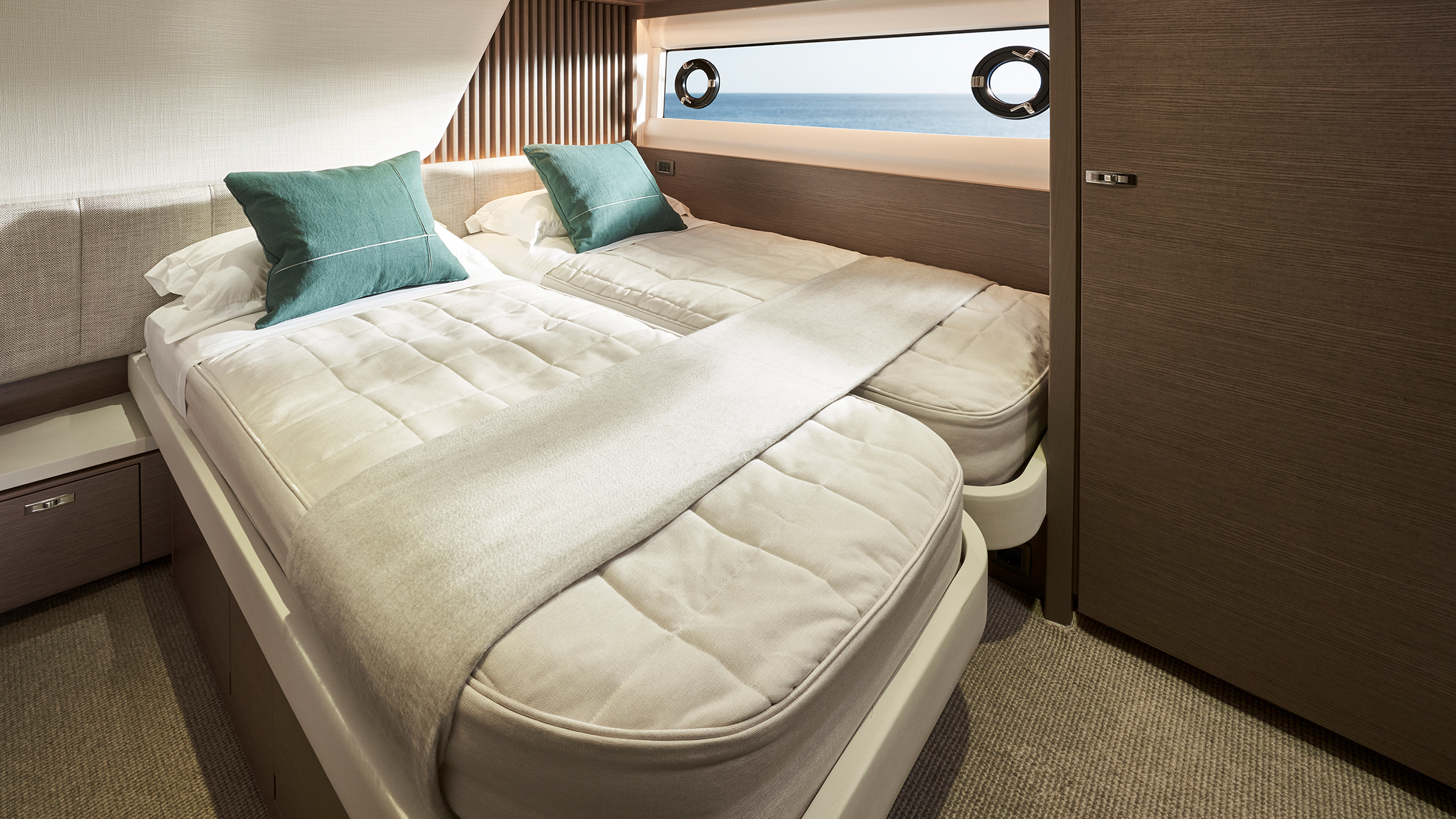 El camarote principal de manga completa se distingue por un diseño refinado gracias a los paneles de inspiración arquitectónica, revestimientos de refrescante lino para la pared, un espejo de tono bronce y un tocador tapizado de cuero Livorno Stone. Posee su propia escalera que conduce a la cubierta principal a través de un vestíbulo privado que da al salón.