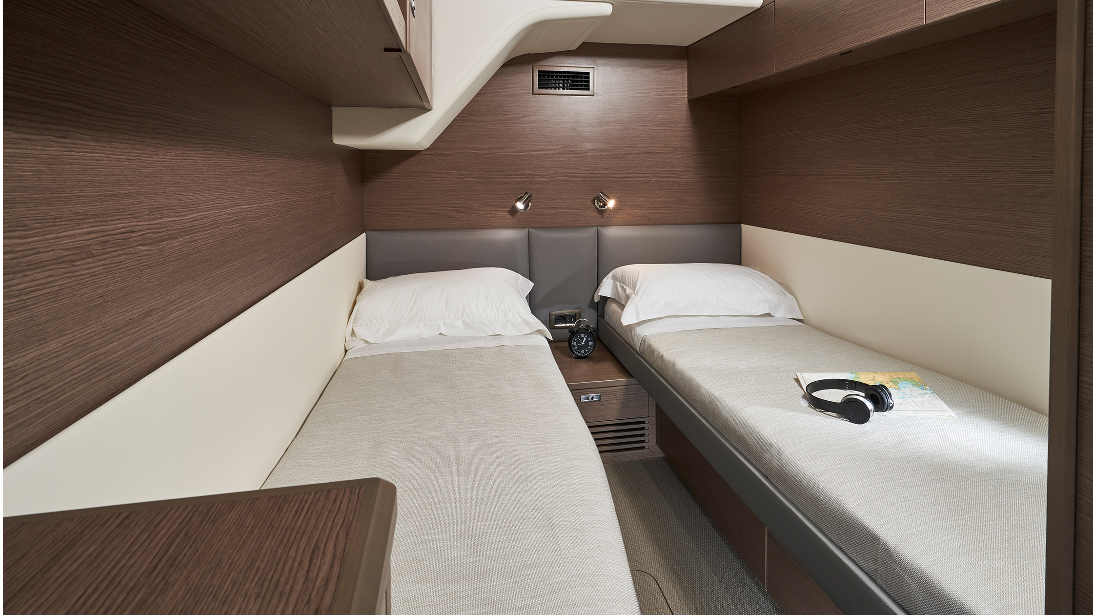 En la parte de proa de la cubierta inferior, seis invitados pueden disfrutar de tres cabinas con un equipamiento sensacional. Además, hay una cabina de popa con baño en suite adicional y dos camas individuales para la tripulación o invitados ocasionales.