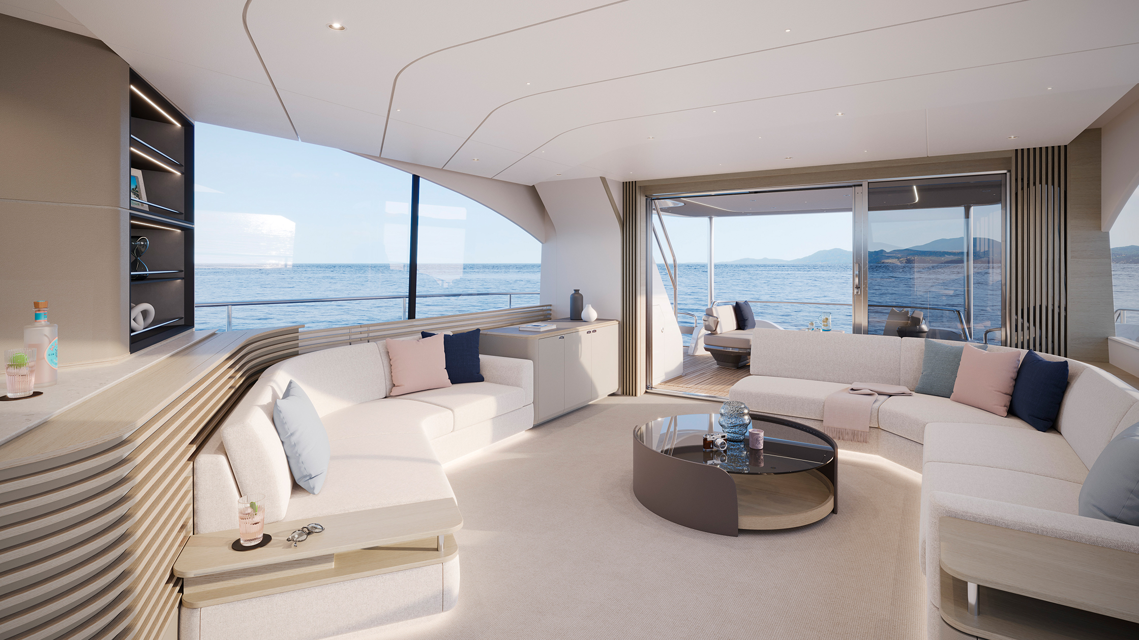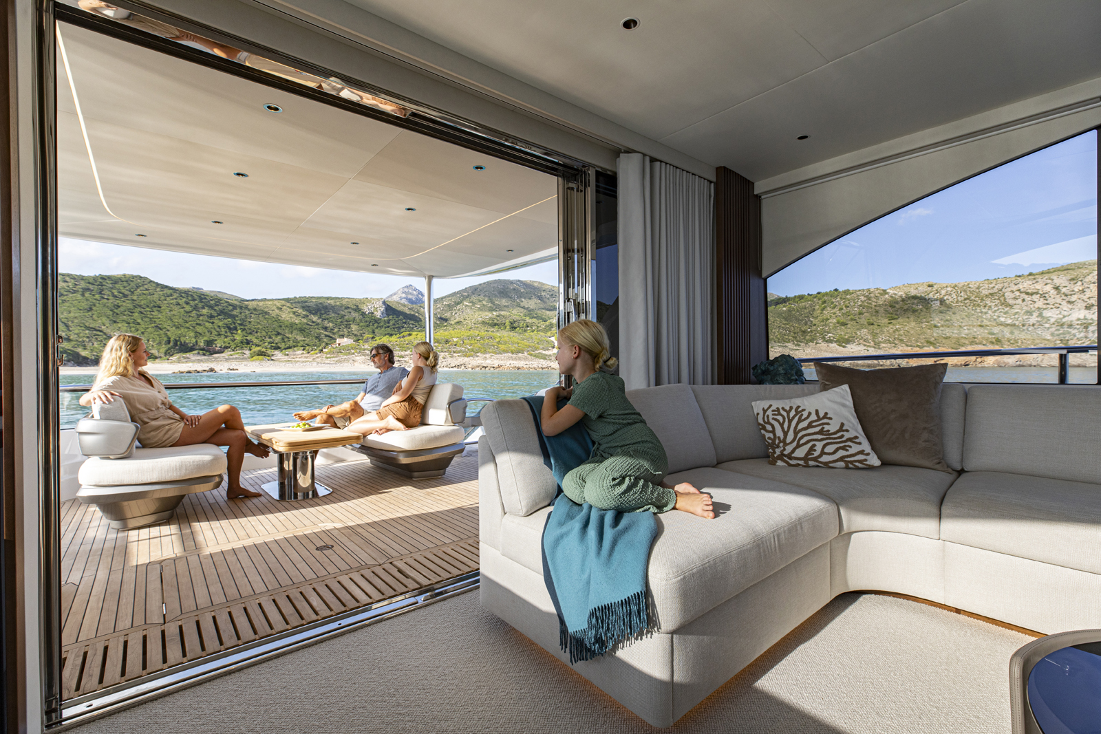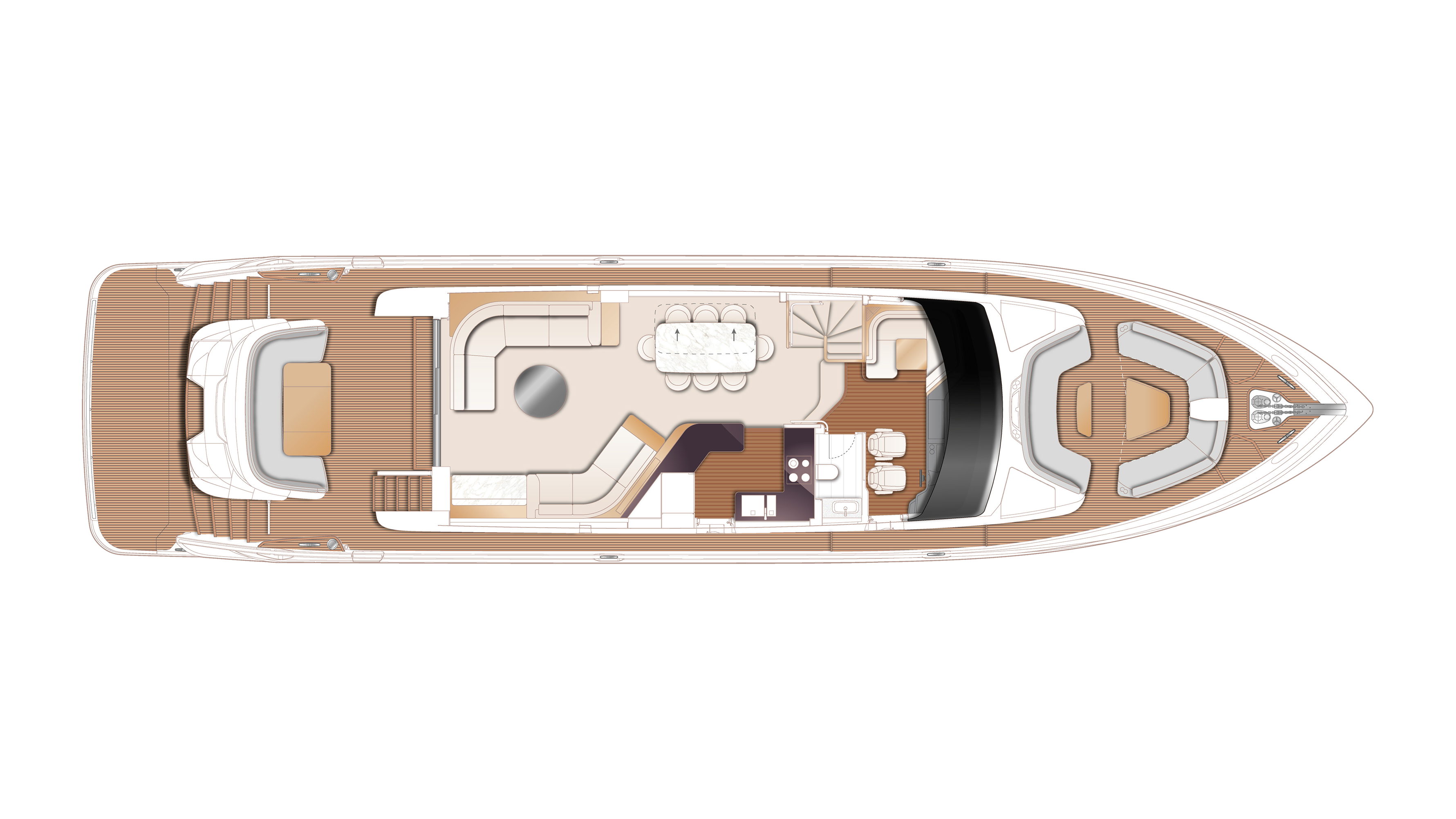 La cubierta principal ofrece un flujo continuo desde la bañera hasta el casco, con amplias ventanas en el salón que revelan unas increíbles vistas panorámicas. Para los propietarios que prefieran una experiencia más privada, hay disponibles divisiones opcionales para la cocina y el puente de mando.