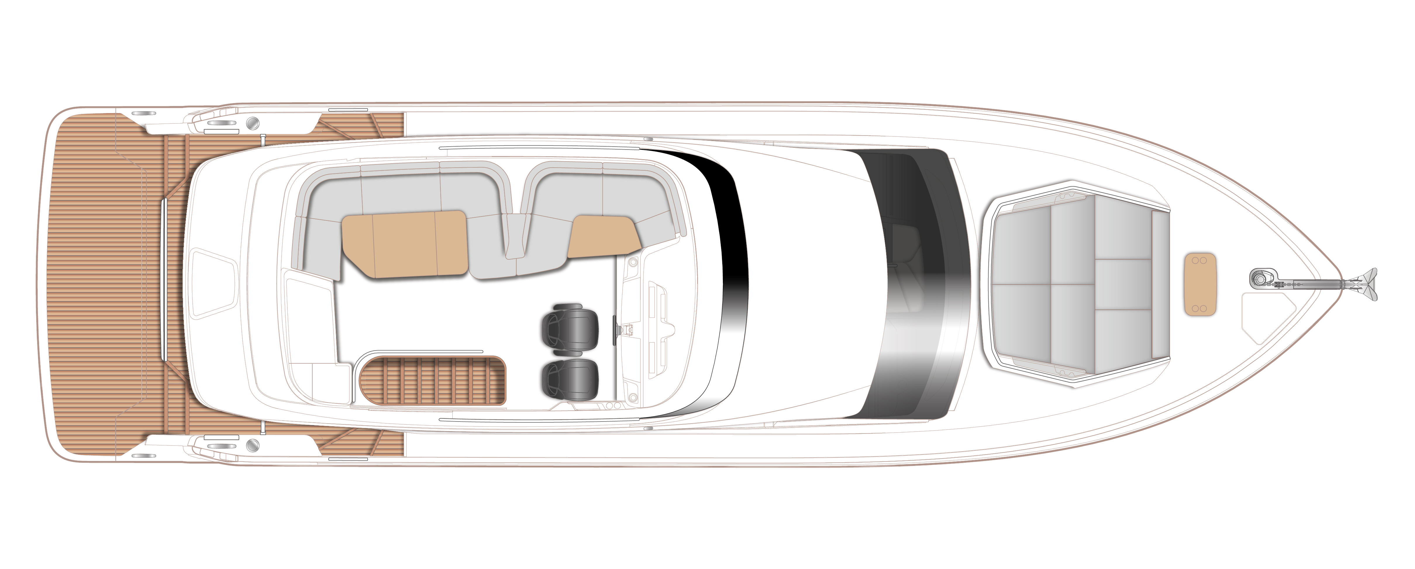 主甲板客厅采用船尾厨房布局,配有独立餐区,在同级别游艇中极为罕见,进一步提升了空间感与灵活性。下层甲板设有三间客舱,可容纳最多六位宾客,包括一间带独立卫浴的全宽主卧舱、一间位于船首的双人舱,以及一间可转换为双人床的双床客舱。可选配尾部船员舱,内设单人双层床、卫生间及储物空间。