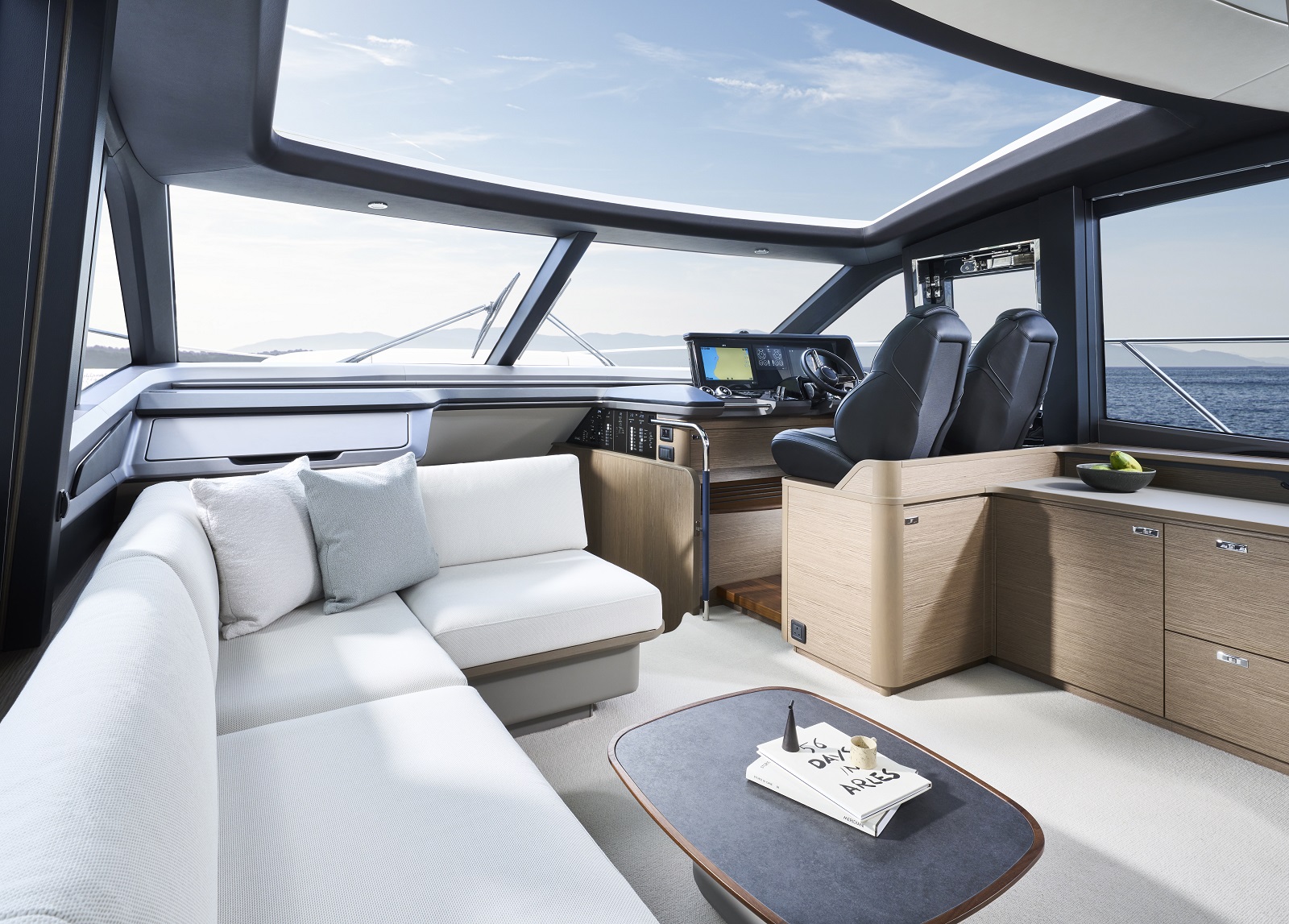甲板区域宽大开阔,拥有宽敞舒适的前甲板座位区、船尾日光浴垫、液压升降式游泳平台以及 3.3 米的快艇库,可作为各种水上运动的完美基地。