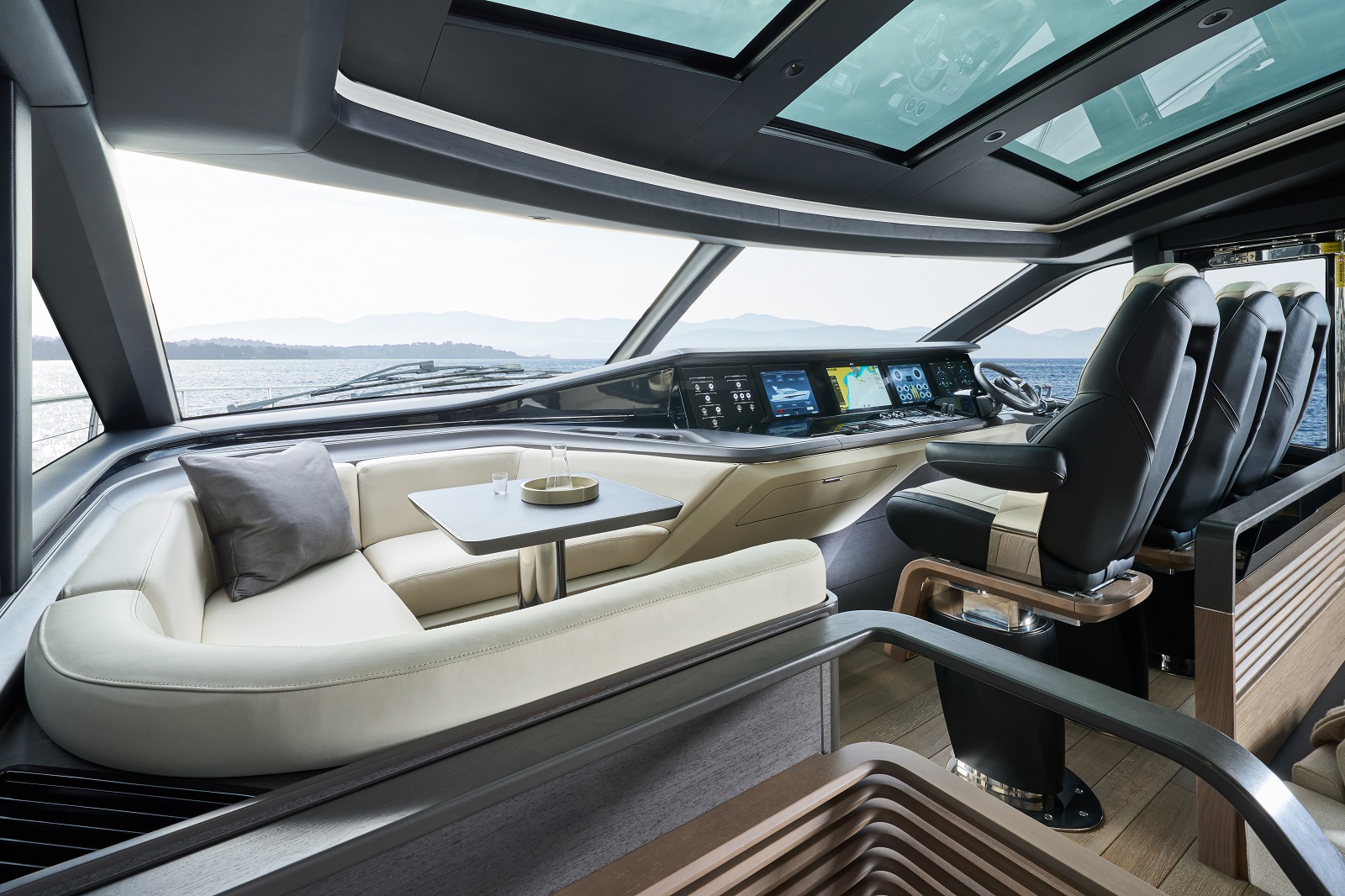 S80 的运动飞桥专为社交娱乐而设计。运动飞桥设有超大 U 形座位区、左右舷配套座椅以及带水槽、冰箱和烧烤炉的备餐区,可选配餐桌和三座椅驾驶台。