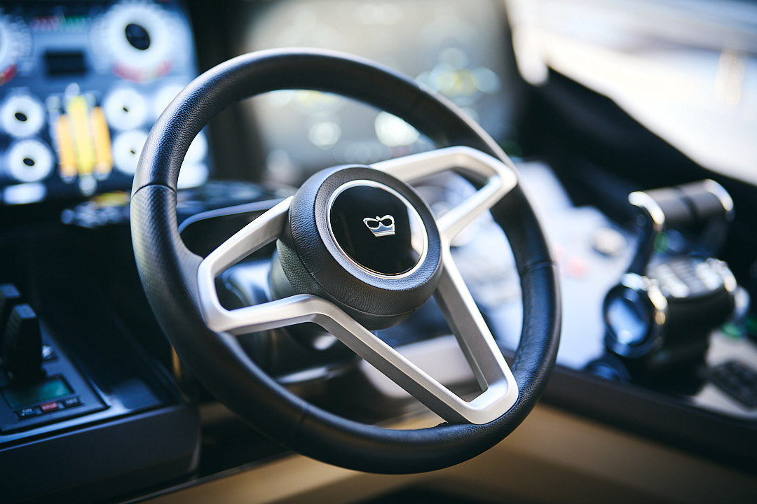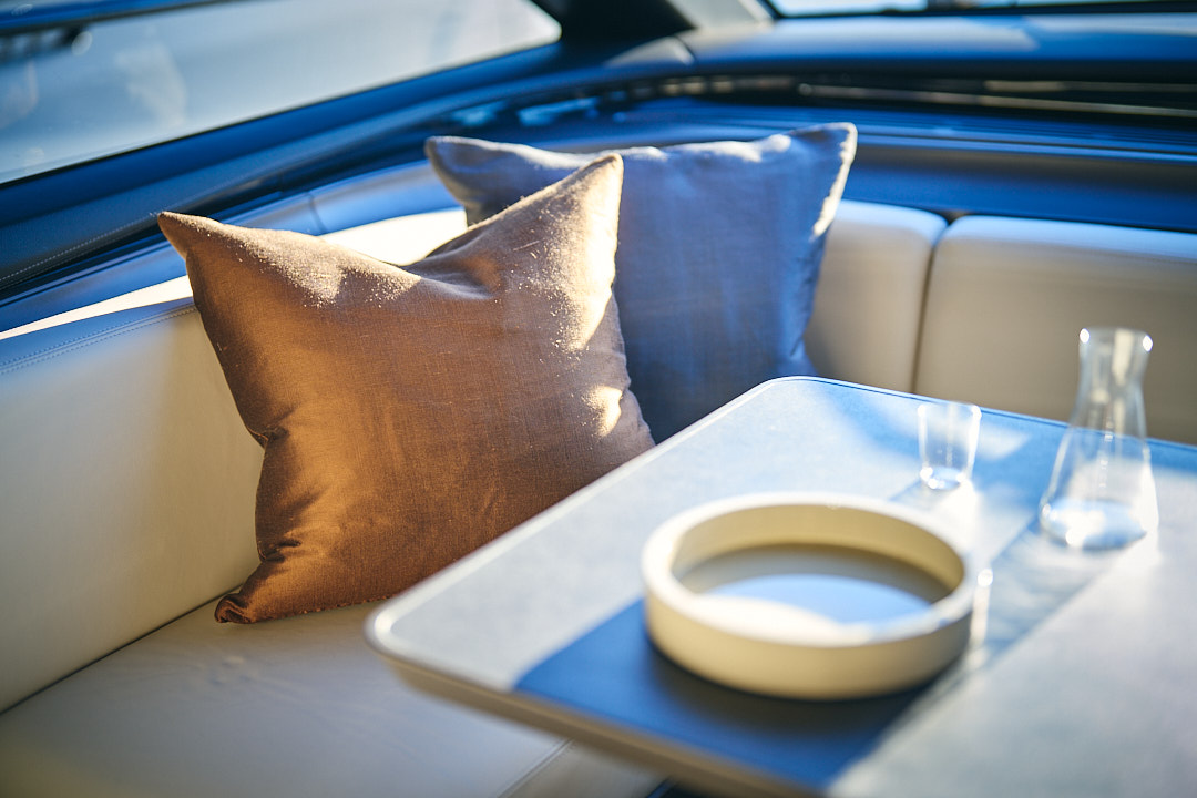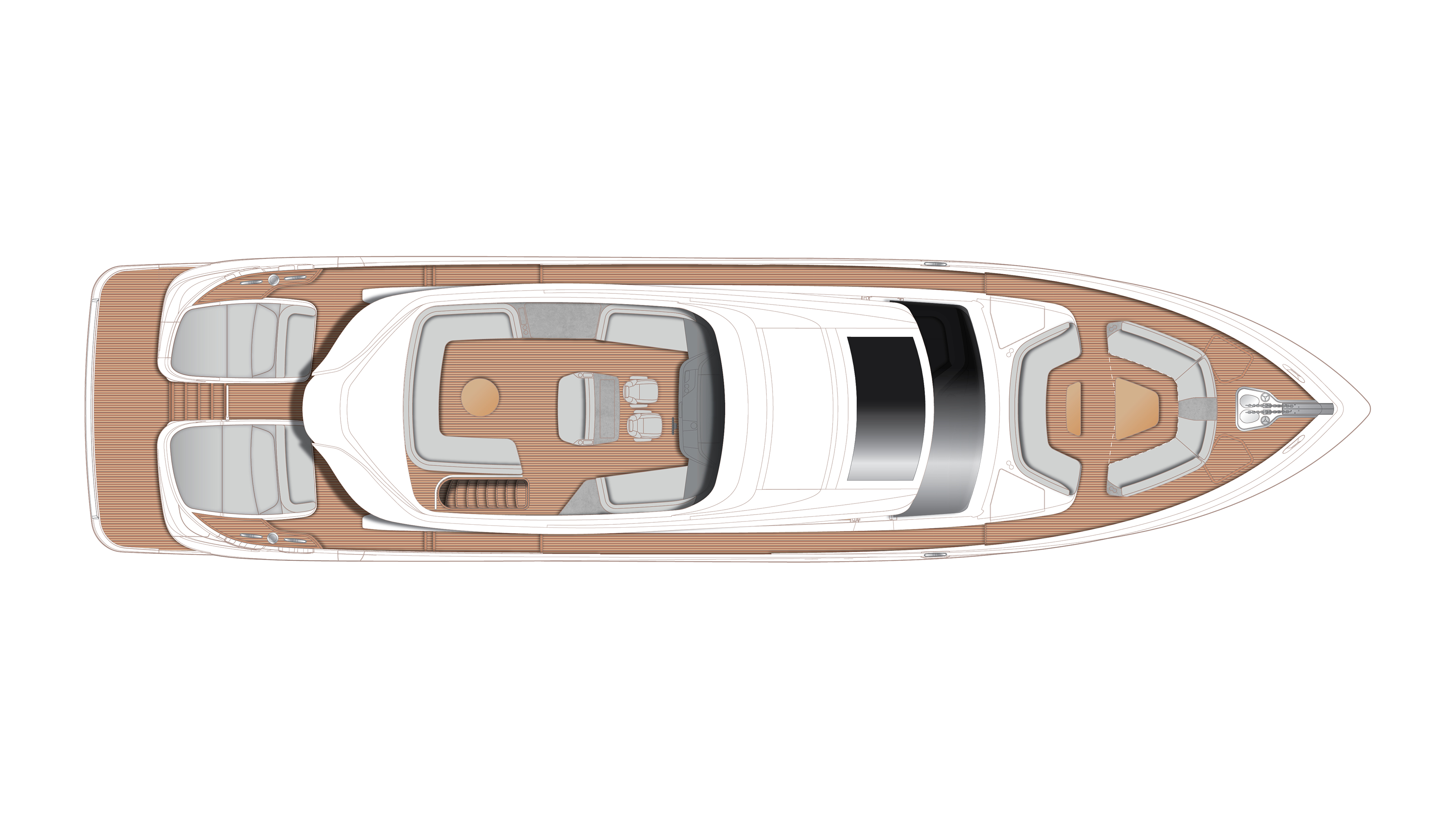 座舱空间极具灵活性,配备可调节布局的座椅系统,其中包括成对 L 形软垫座椅,可手动调节至内侧、外侧或前向位置,满足多样化使用需求。两侧船尾日光浴垫环绕着柚木铺设的台阶,通往宽敞的电动液压升降式游泳平台。