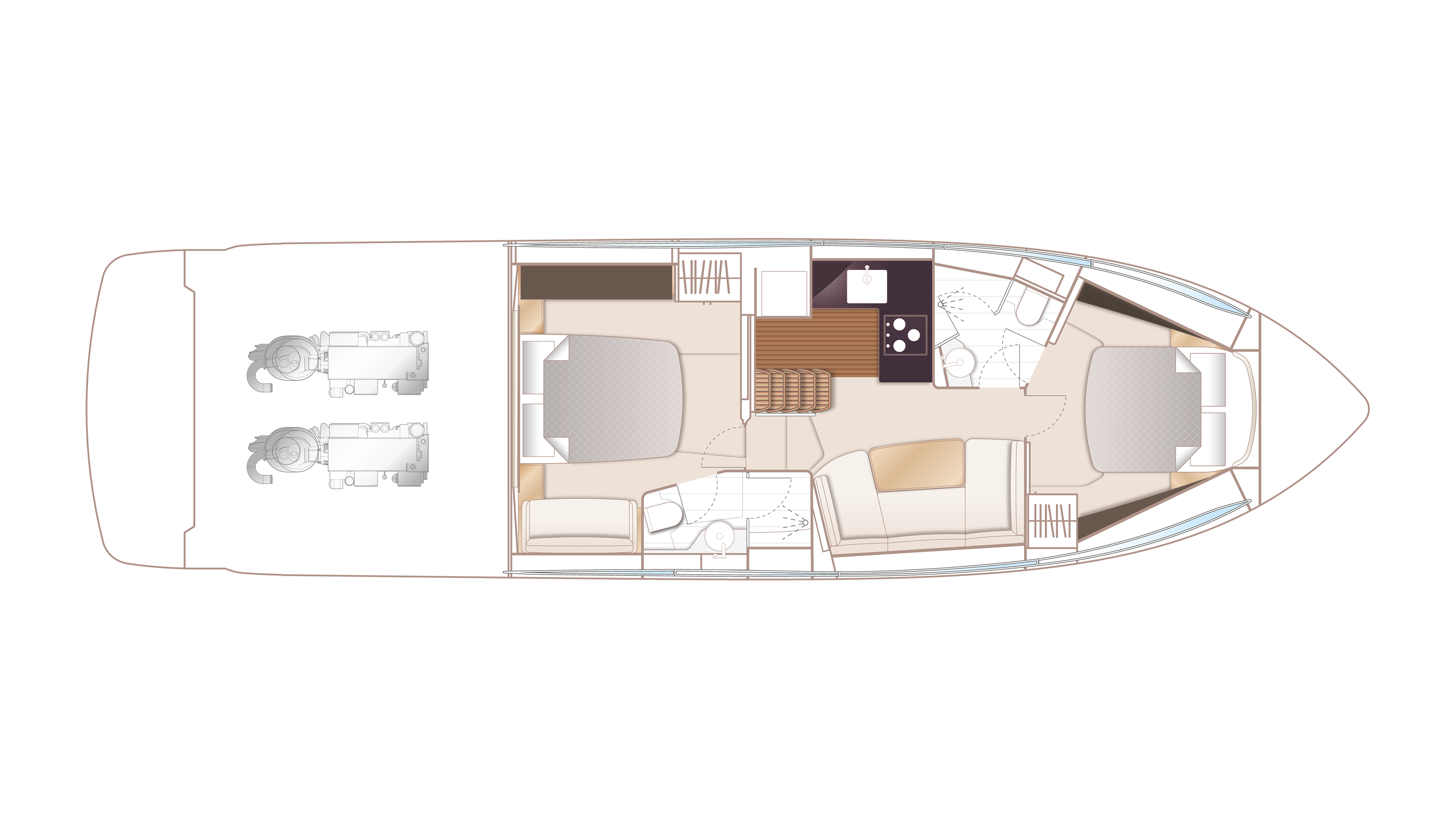 主甲板下设有宽敞明亮、设施先进的厨房,对面是社交娱乐空间。两间精美考究的卧舱可供四位宾客入住,通过宽阔的船体舷窗采纳充足的自然光,一间全宽式主卧舱位于船中部。船首独卫卧舱配有通向客厅的附加通道,可在需要时作为日用洗手间使用。